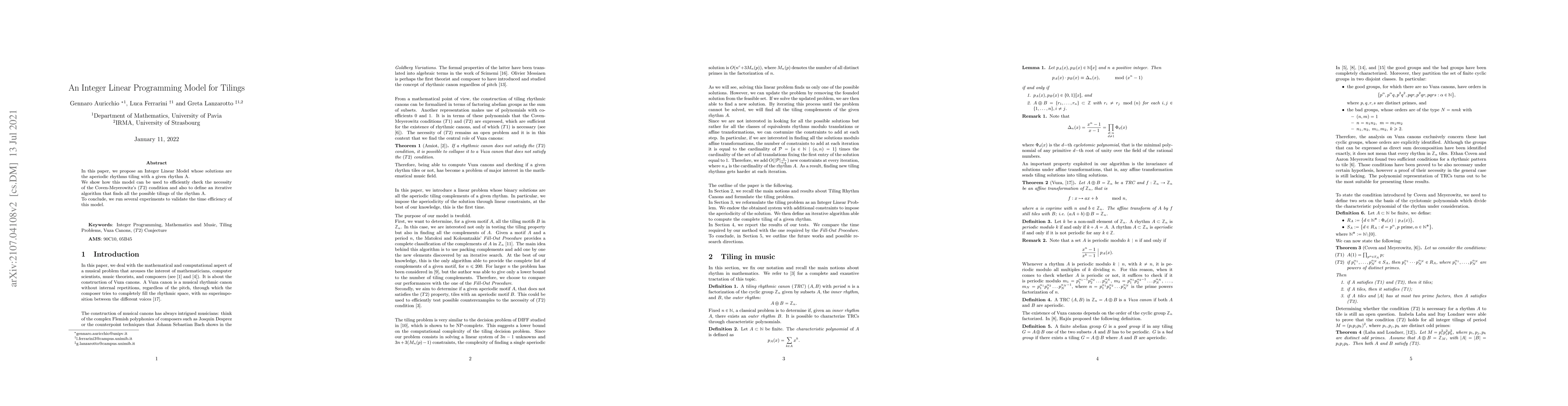 In this paper, we propose an Integer Linear Model whose solutions are the aperiodic rhythms tiling with a given rhythm A. We show how this model can be used to efficiently check the necessity of the Coven-Meyerowitz's $(T2)$ condition and also to define an iterative algorithm that finds all the possible tilings of the rhythm A. To conclude, we run several experiments to validate the time efficiency of this model.