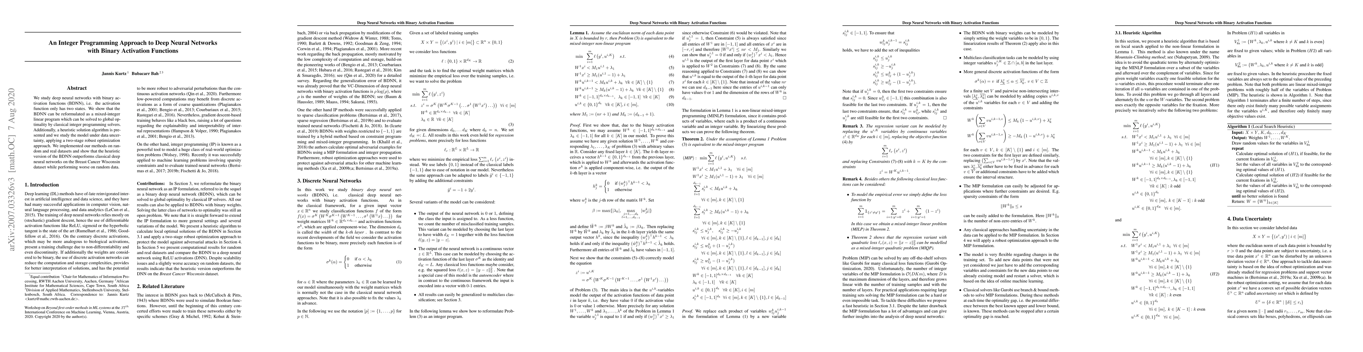 This paper reformulates deep neural networks with binary activation functions as a mixed-integer linear program, solvable via classical integer programming solvers. It also presents a heuristic solution and a two-stage robust optimization approach for data uncertainty, demonstrating superior performance of the heuristic version on the Breast Cancer Wisconsin dataset compared to classical deep neural networks.