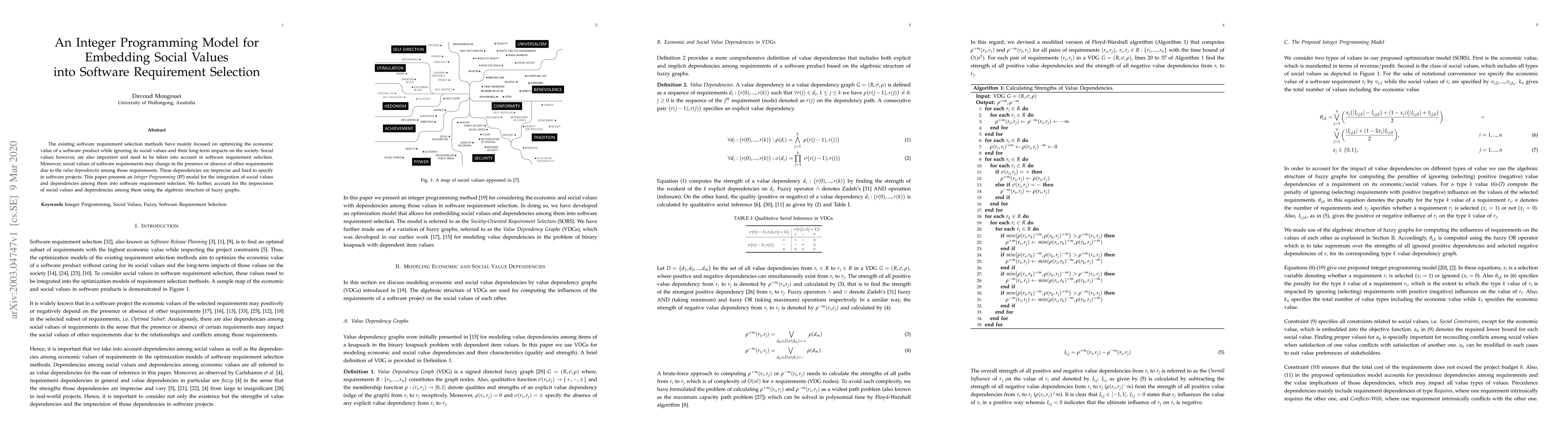 This paper proposes an Integer Programming model to incorporate social values and their dependencies into software requirement selection, addressing the oversight of social impacts in existing methods. It also utilizes fuzzy graphs to manage the imprecision of social values and inter-requirement dependencies.