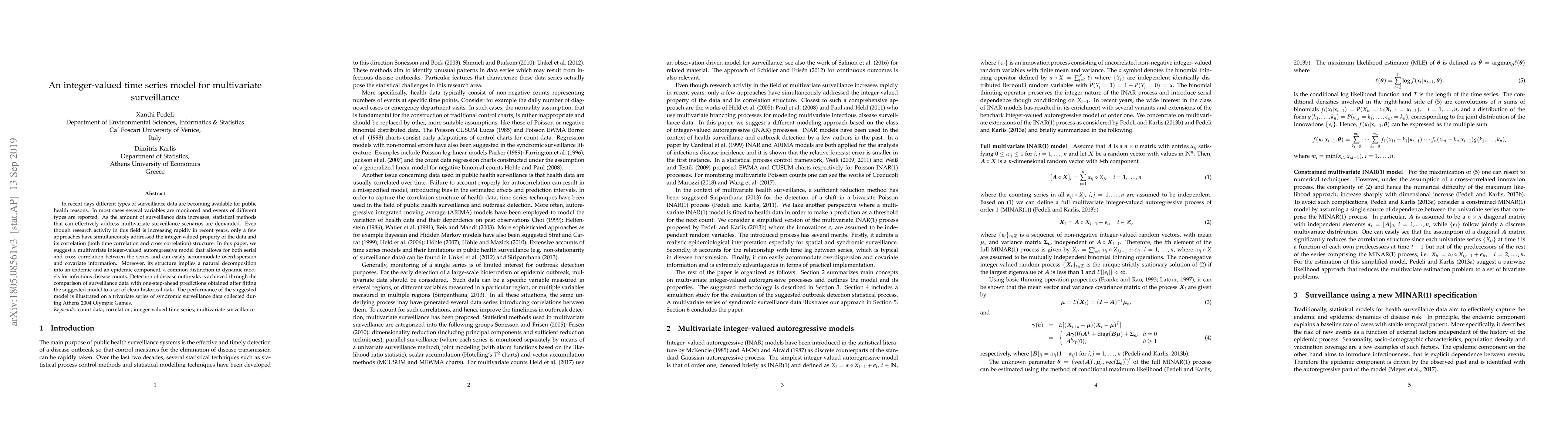 This paper proposes a multivariate integer-valued autoregressive model to handle correlated surveillance data, accommodating overdispersion and covariates. It enables the detection of disease outbreaks by comparing real data to model predictions, demonstrated using syndromic data from the Athens 2004 Olympic Games.