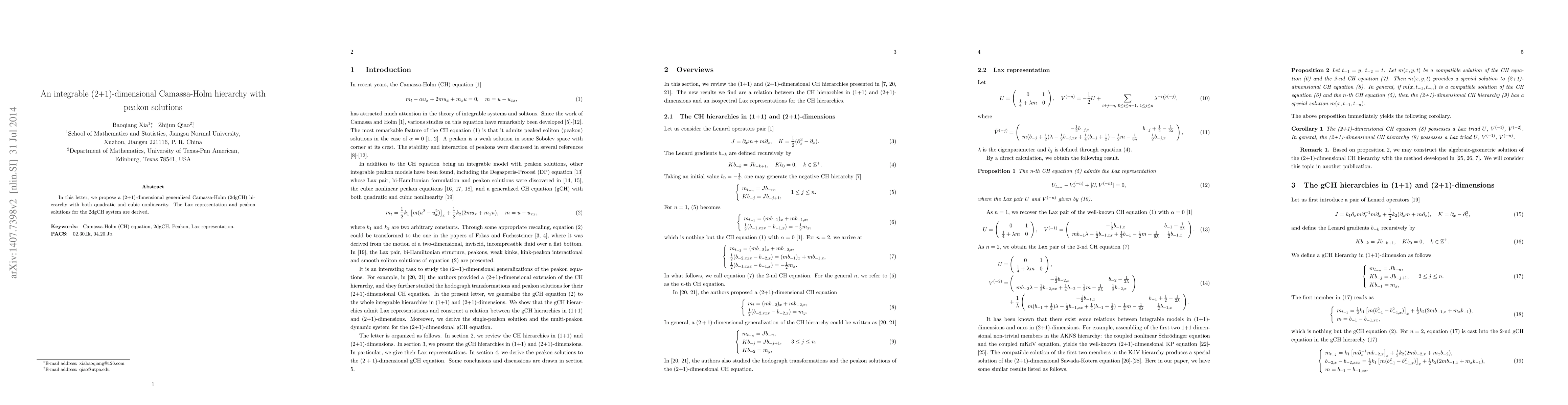 Summary: This paper introduces a generalized (2+1)-dimensional Camassa-Holm hierarchy with quadratic and cubic nonlinearities, and presents its Lax representation along with peakon solutions.