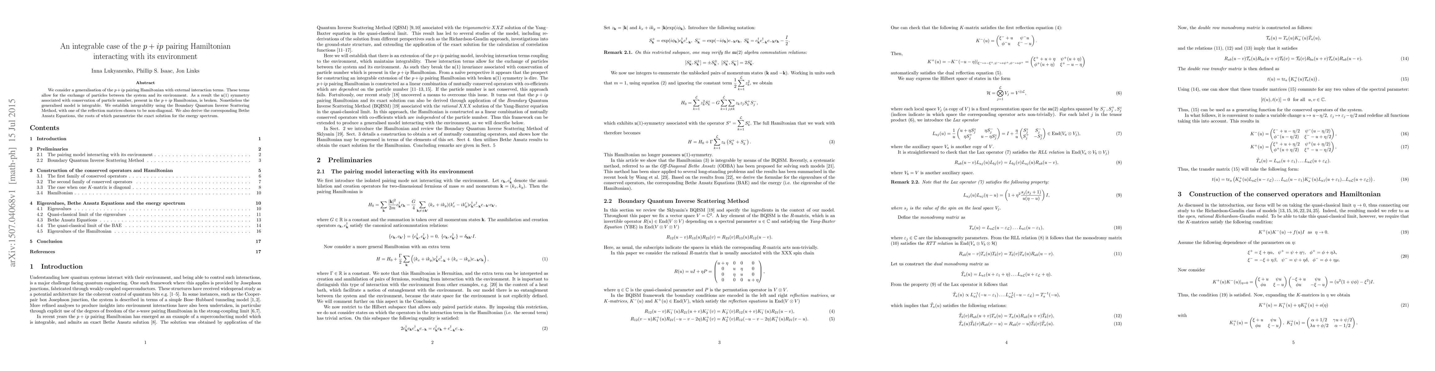 We consider a generalisation of the p+ip pairing Hamiltonian with external interaction terms. These terms allow for the exchange of particles between the system and its environment. As a result the u(1) symmetry associated with conservation of particle number, present in the p+ip Hamiltonian, is broken. Nonetheless the generalised model is integrable. We establish integrability using the Boundary Quantum Inverse Scattering Method, with one of the reflection matrices chosen to be non-diagonal. We also derive the corresponding Bethe Ansatz Equations, the roots of which parametrise the exact solution for the energy spectrum.