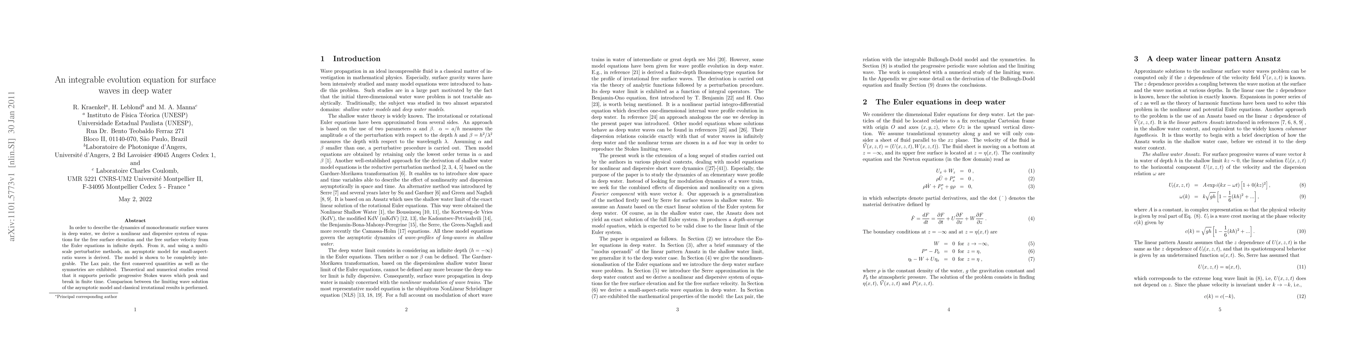 In order to describe the dynamics of monochromatic surface waves in deep water, we derive a nonlinear and dispersive system of equations for the free surface elevation and the free surface velocity from the Euler equations in infinite depth. From it, and using a multiscale perturbative methods, an asymptotic model for small-aspect-ratio waves is derived. The model is shown to be completely integrable. The Lax pair, the first conserved quantities as well as the symmetries are exhibited. Theoretical and numerical studies reveal that it supports periodic progressive Stokes waves which peak and break in finite time. Comparison between the limiting wave solution of the asymptotic model and classical irrotational results is performed.