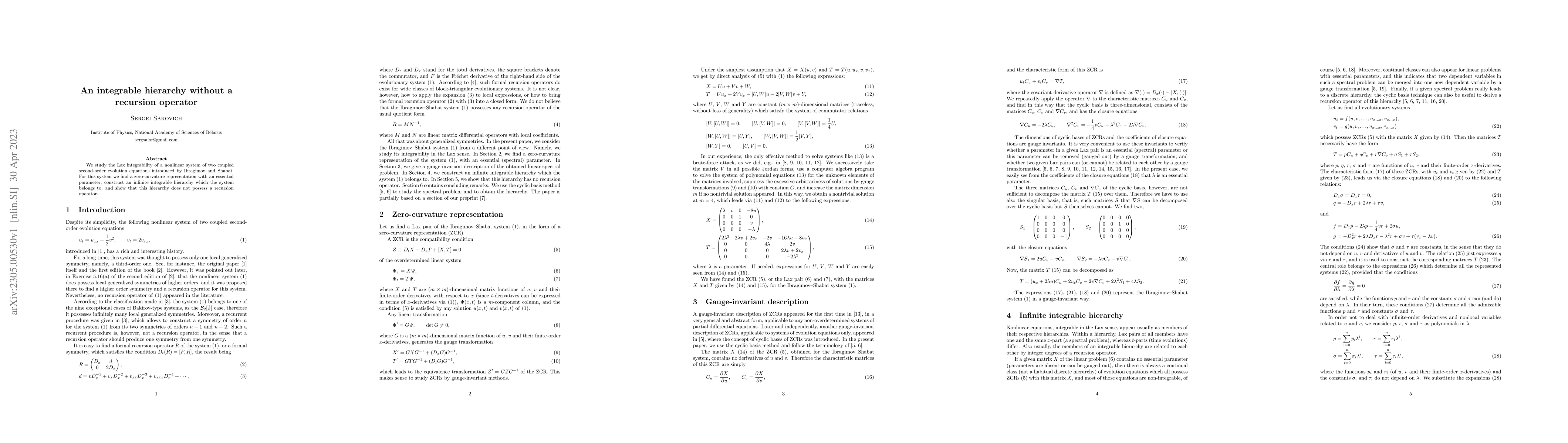 This paper explores the Lax integrability of a nonlinear system of coupled second-order evolution equations, constructing an infinite integrable hierarchy without a recursion operator, despite the absence of a standard recursion operator.
