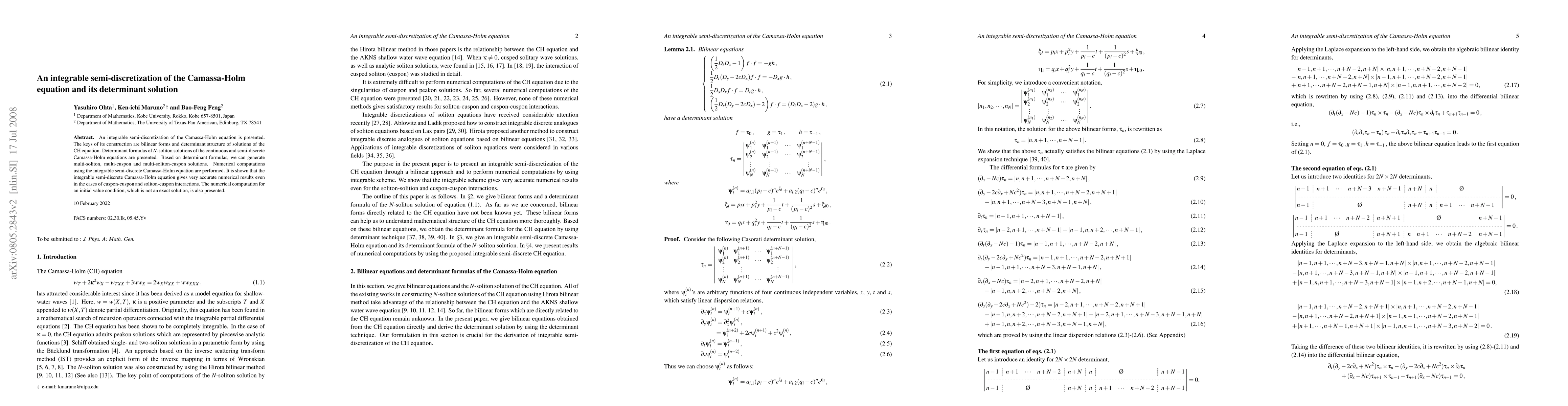 This paper presents an integrable semi-discretization of the Camassa-Holm equation using bilinear forms and determinant structures. It provides determinant formulas for $N$-soliton solutions and demonstrates accurate numerical results for multi-soliton, multi-cuspon, and soliton-cuspon interactions.
