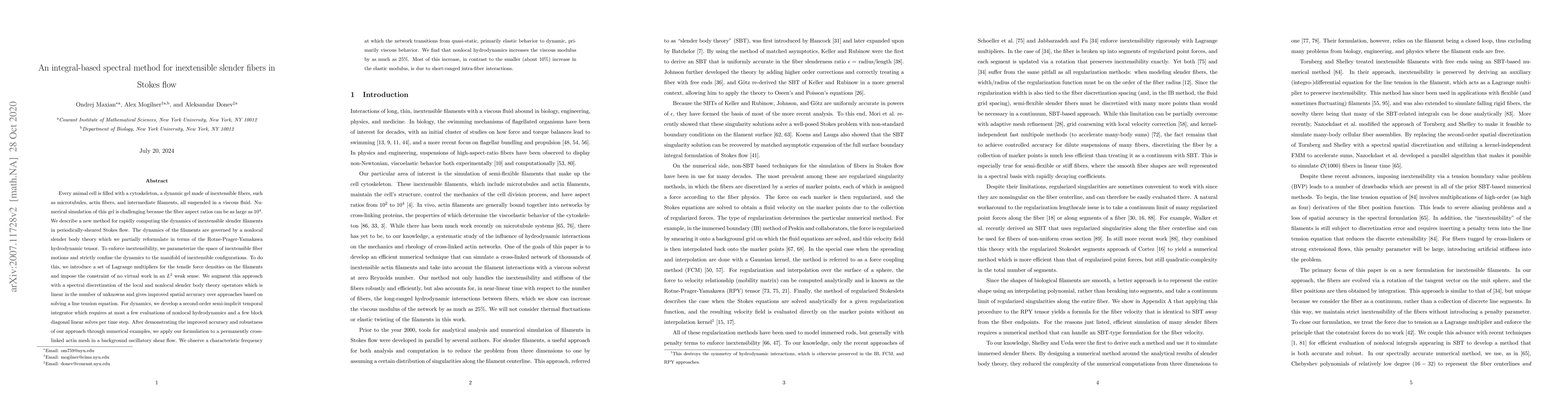 This paper introduces an integral-based spectral method for simulating the dynamics of inextensible slender fibers in Stokes flow, addressing the computational challenges posed by high aspect ratios. The method enforces inextensibility through Lagrange multipliers and spectral discretization, achieving improved accuracy and efficiency.