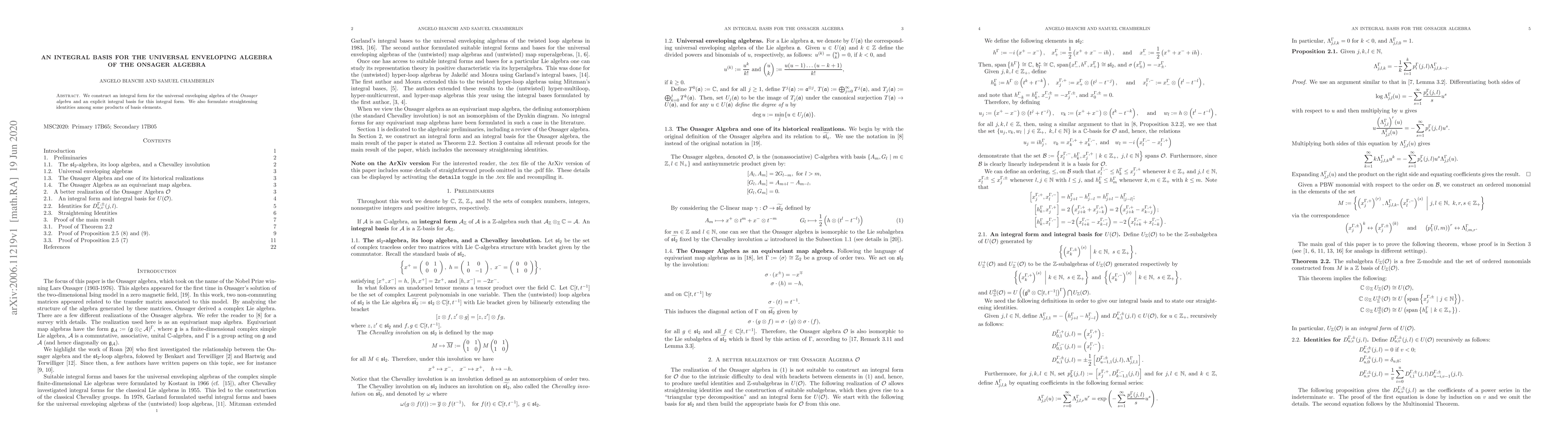 This paper constructs an integral form for the universal enveloping algebra of the Onsager algebra and provides an explicit integral basis for it, along with straightening identities for certain products of these basis elements.