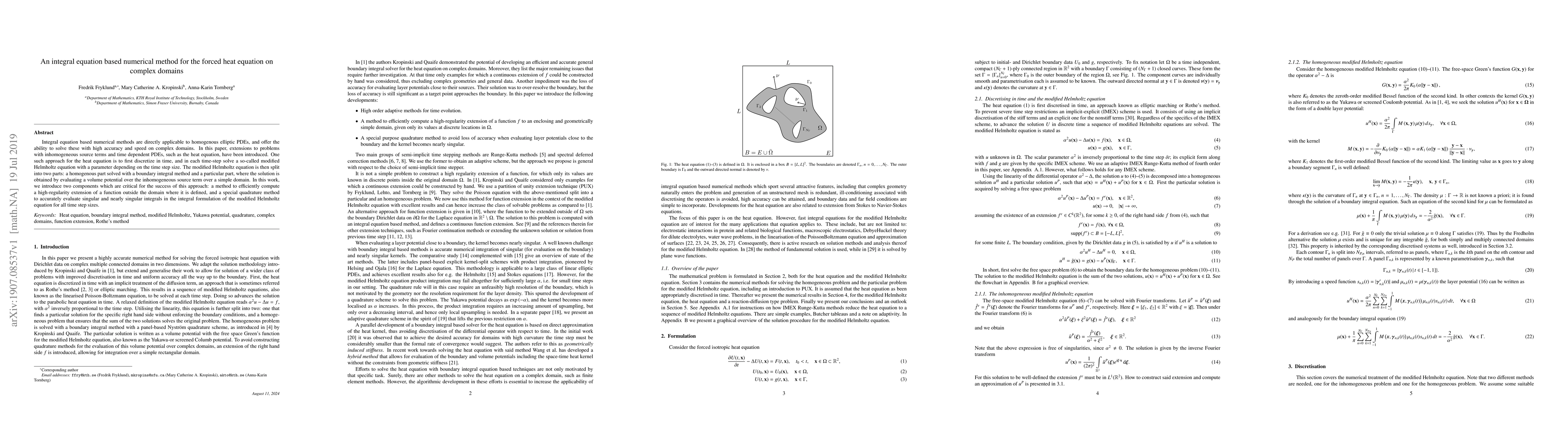 This paper proposes an integral equation-based numerical method for solving the forced heat equation on complex domains, extending the approach to handle inhomogeneous source terms and time-dependent PDEs. It introduces a method for efficiently computing high-regularity extensions and a specialized quadrature technique to accurately evaluate singular integrals.