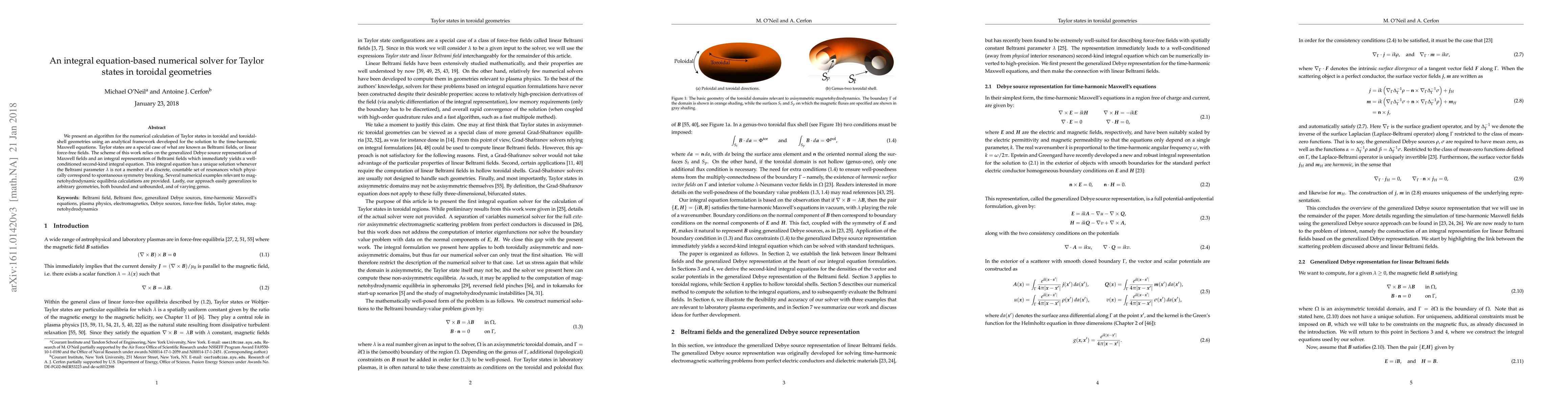 We develop an algorithm for the numerical calculation of Taylor states in toroidal and toroidal shell geometries using an analytical framework developed for the solution to the time-harmonic Maxwell equations. Taylor states are a special case of what are known as Beltrami fields, or linear force-free fields. The scheme of this work relies on the generalized Debye source representation of Maxwell fields and an integral representation of Beltrami fields which immediately yields a well-conditioned second-kind integral equation. This integral equation has a unique solution whenever the Beltrami parameter $\lambda$ is not a member of a discrete, countable set of resonances which physically correspond to spontaneous symmetry breaking. Several numerical examples relevant to magnetohydrodynamic equilibria calculations are provided. Lastly, our approach easily generalizes to arbitrary geometries, both bounded and unbounded, and of varying genus.