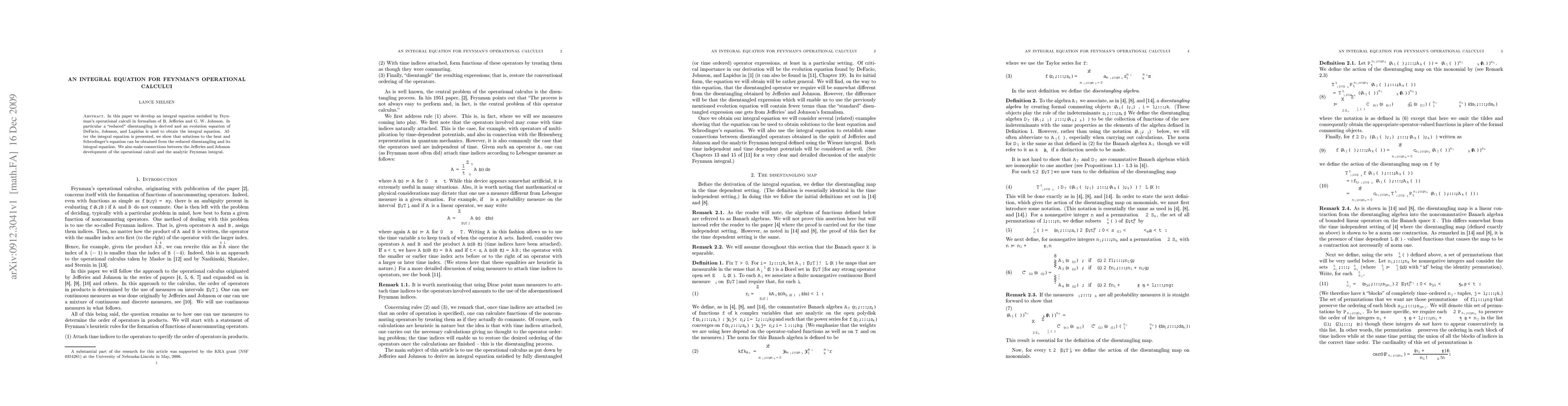 In this paper we develop an integral equation satisfied by Feynman's operational calculi in formalism of B. Jefferies and G. W. Johnson. In particular a "reduced" disentangling is derived and an evolution equation of DeFacio, Johnson, and Lapidus is used to obtain the integral equation. After the integral equation is presented, we show that solutions to the heat and Schrodinger's equation can be obtained from the reduced disentangling and its integral equation. We also make connections between the Jefferies and Johnson development of the operational calculi and the analytic Feynman integral.