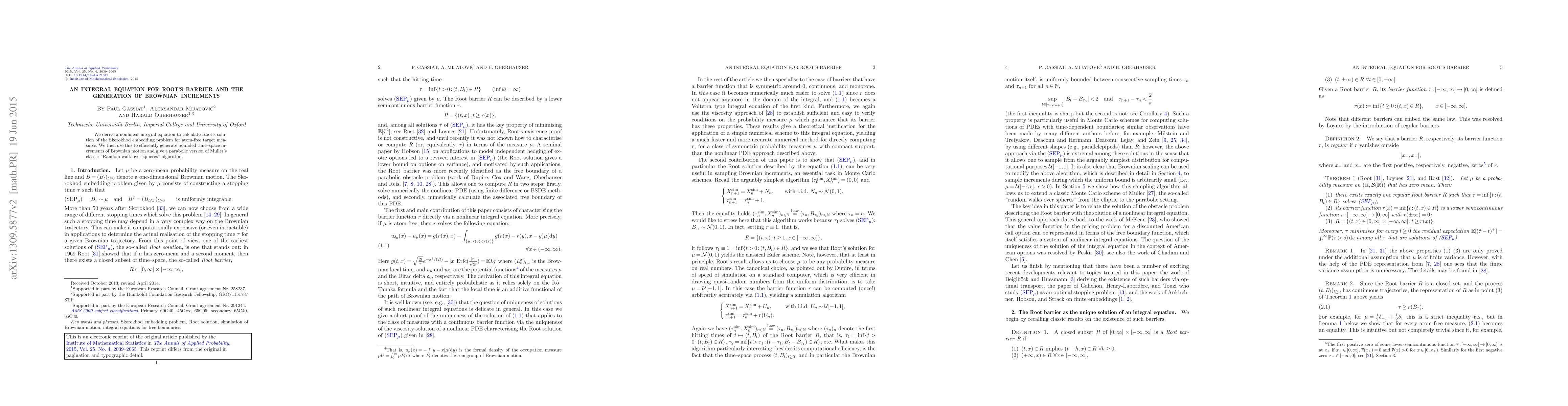 Summary: This paper derives a nonlinear integral equation for Root's solution to the Skorokhod embedding problem, and utilizes it to efficiently generate bounded time-space increments of Brownian motion, including a parabolic version of Muller's "Random walk over spheres" algorithm.
