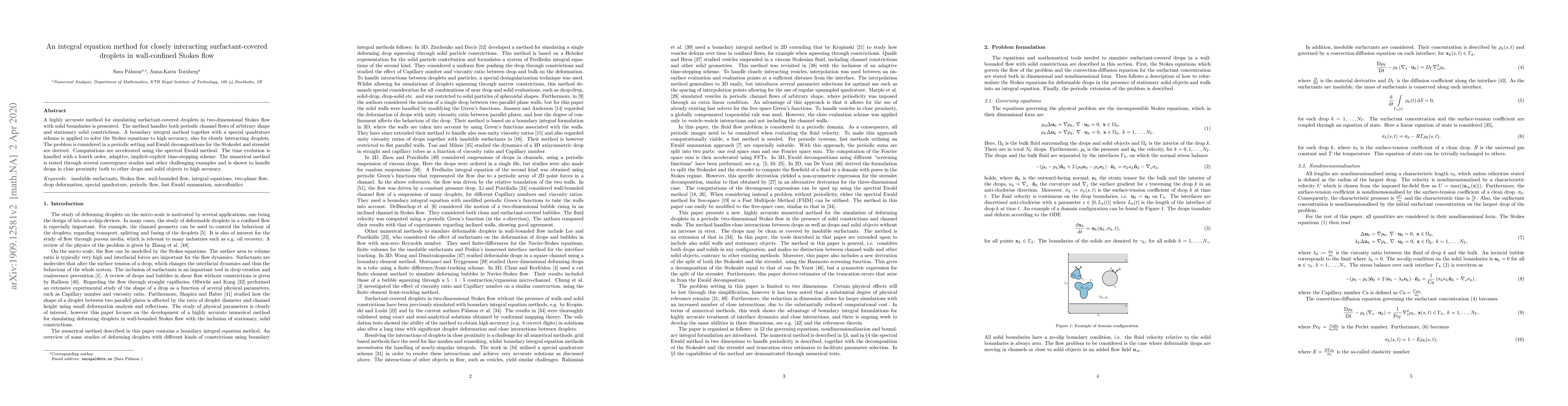 A highly accurate method for simulating surfactant-covered droplets in two-dimensional Stokes flow with solid boundaries is presented. The method handles both periodic channel flows of arbitrary shape and stationary solid constrictions. A boundary integral method together with a special quadrature scheme is applied to solve the Stokes equations to high accuracy, also for closely interacting droplets. The problem is considered in a periodic setting and Ewald decompositions for the Stokeslet and stresslet are derived. Computations are accelerated using the spectral Ewald method. The time evolution is handled with a fourth order, adaptive, implicit-explicit time-stepping scheme. The numerical method is tested through several convergence studies and other challenging examples and is shown to handle drops in close proximity both to other drops and solid objects to high accuracy.