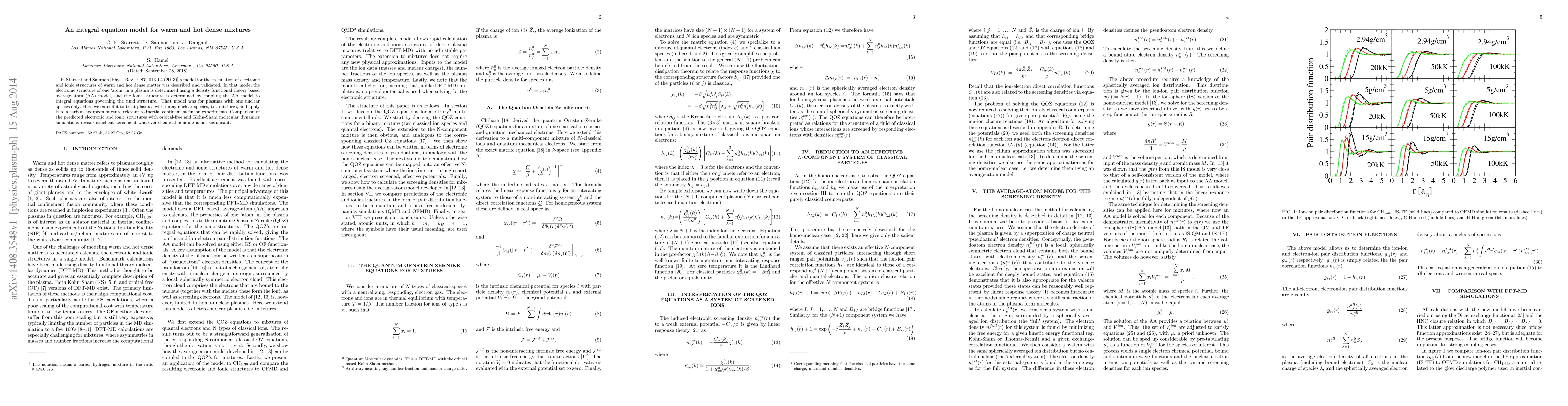 In Starrett and Saumon [Phys. Rev. E 87, 013104 (2013)] a model for the calculation of electronic and ionic structures of warm and hot dense matter was described and validated. In that model the electronic structure of one "atom" in a plasma is determined using a density functional theory based average-atom (AA) model, and the ionic structure is determined by coupling the AA model to integral equations governing the fluid structure. That model was for plasmas with one nuclear species only. Here we extend it to treat plasmas with many nuclear species, i.e. mixtures, and apply it to a carbon-hydrogen mixture relevant to inertial confinement fusion experiments. Comparison of the predicted electronic and ionic structures with orbital-free and Kohn-Sham molecular dynamics simulations reveals excellent agreement wherever chemical bonding is not significant.