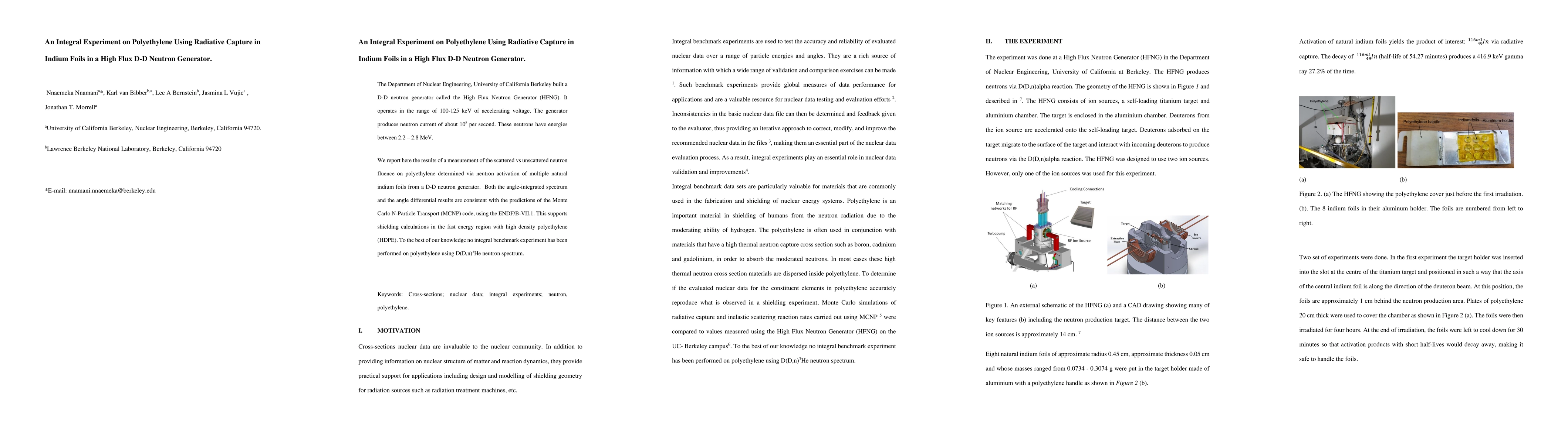 The Department of Nuclear Engineering, University of California Berkeley built a D-D neutron generator called the High Flux Neutron Generator (HFNG). It operates in the range of 100-125 keV of accelerating voltage. The generator produces neutron current of about 10^8 per second. These neutrons have energies between 2.2-2.8 MeV. We report here the results of a measurement of the scattered vs unscattered neutron fluence on polyethylene determined via neutron activation of multiple natural indium foils from a D-D neutron generator. Both the angle-integrated spectrum and the angle differential results are consistent with the predictions of the Monte Carlo N-Particle Transport (MCNP) code, using the ENDF/B-VII.1. This supports shielding calculations in the fast energy region with high density polyethylene (HDPE). To the best of our knowledge no integral benchmark experiment has been performed on polyethylene using D(D,n)alpha neutron spectrum.