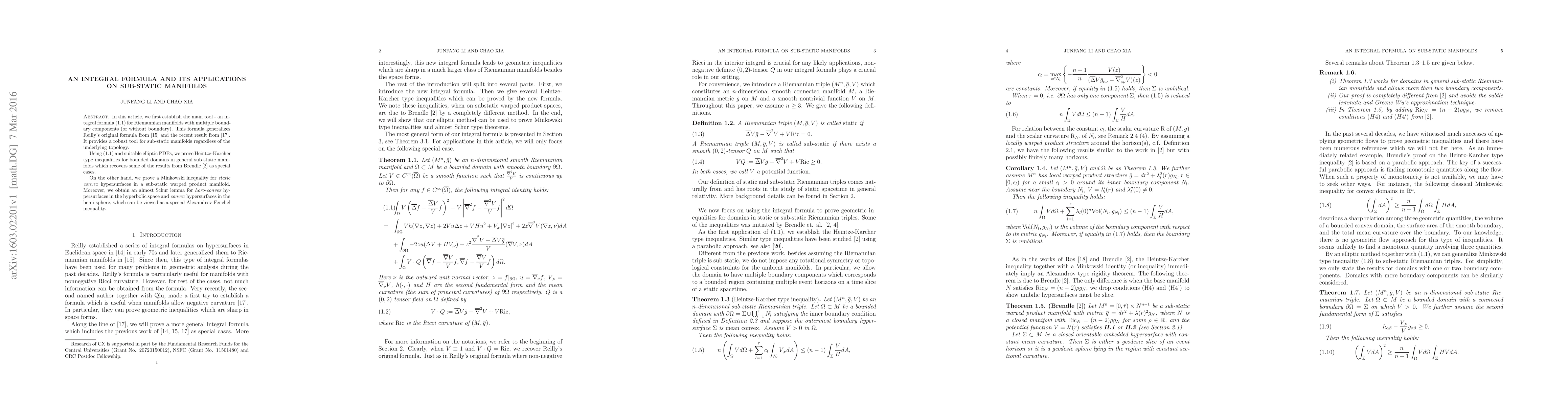 In this article, we first establish the main tool - an integral formula for Riemannian manifolds with multiple boundary components (or without boundary). This formula generalizes Reilly's original formula from \cite{Re2} and the recent result from \cite{QX}. It provides a robust tool for sub-static manifolds regardless of the underlying topology. Using this formula and suitable elliptic PDEs, we prove Heintze-Karcher type inequalities for bounded domains in general sub-static manifolds which recovers some of the results from Brendle \cite{Br} as special cases. On the other hand, we prove a Minkowski inequality for static convex hypersurfaces in a sub-static warped product manifold. Moreover, we obtain an almost Schur lemma for horo-convex hypersurfaces in the hyperbolic space and convex hypersurfaces in the hemi-sphere, which can be viewed as a special Alexandrov-Fenchel inequality.