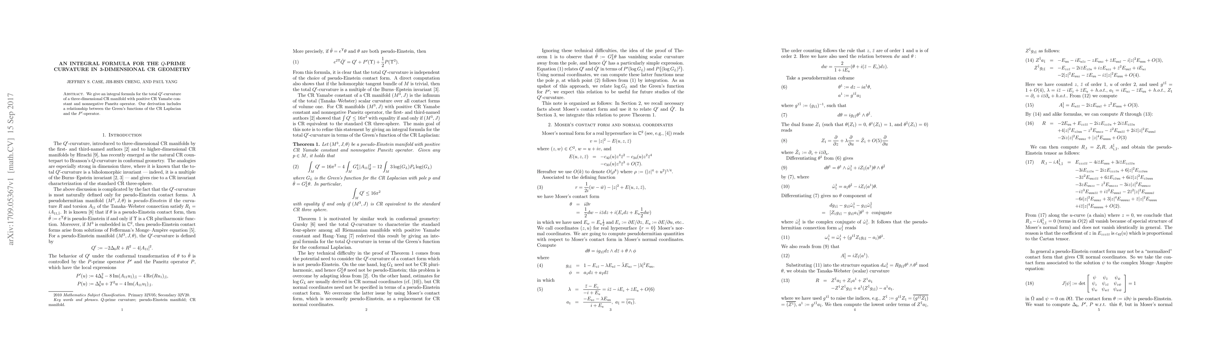 We give an integral formula for the total $Q^\prime$-curvature of a three-dimensional CR manifold with positive CR Yamabe constant and nonnegative Paneitz operator. Our derivation includes a relationship between the Green's functions of the CR Laplacian and the $P^\prime$-operator.