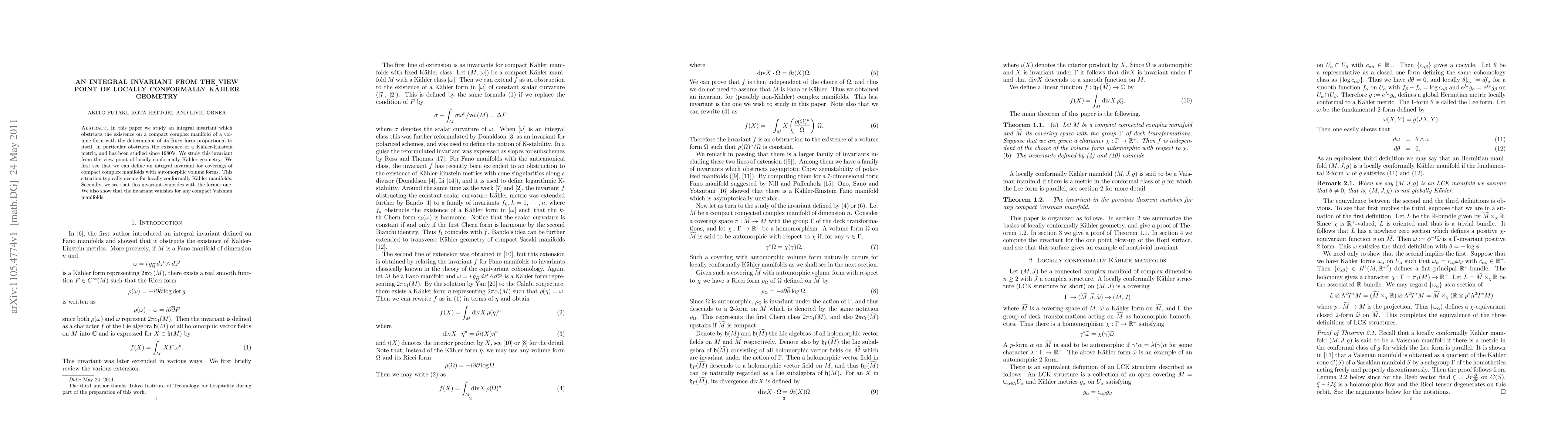 This paper investigates an integral invariant related to the existence of a volume form with a specific property on compact complex manifolds, particularly focusing on locally conformally Kähler geometry. The research defines this invariant for coverings of such manifolds and shows it aligns with previous studies. It also reveals that this invariant vanishes for all compact Vaisman manifolds.