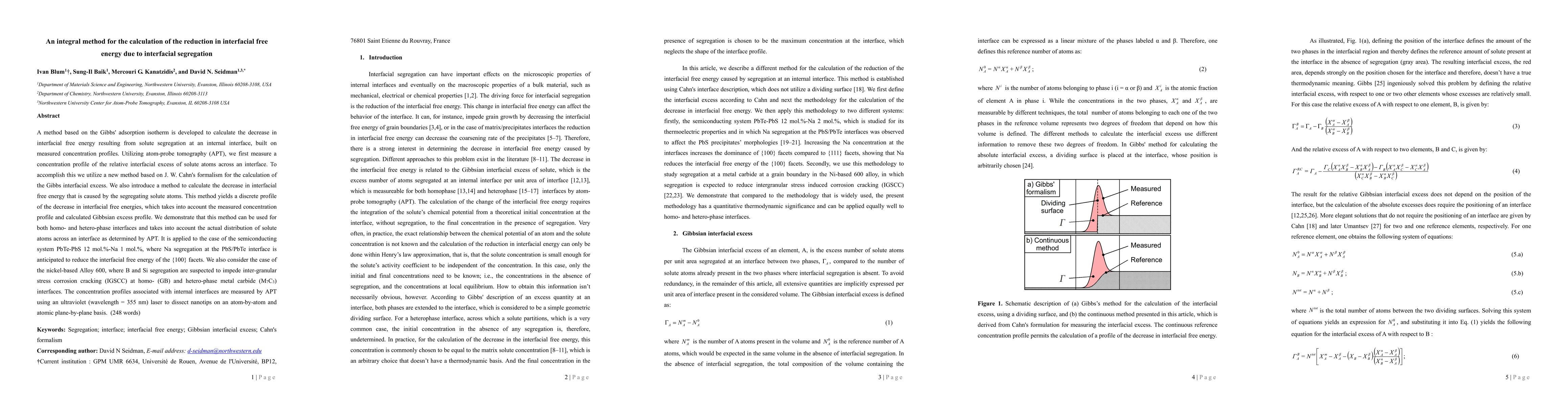 A method based on the Gibbs' adsorption isotherm is developed to calculate the decrease in interfacial free energy resulting from solute segregation at an internal interface, built on measured concentration profiles. Utilizing atom-probe tomography (APT), we first measure a concentration profile of the relative interfacial excess of solute atoms across an interface. To accomplish this we utilize a new method based on J. W. Cahn's formalism for the calculation of the Gibbs interfacial excess. We also introduce a method to calculate the decrease in interfacial free energy that is caused by the segregating solute atoms. This method yields a discrete profile of the decrease in interfacial free energies, which takes into account the measured concentration profile and calculated Gibbsian excess profile. We demonstrate that this method can be used for both homo- and hetero-phase interfaces and takes into account the actual distribution of solute atoms across an interface as determined by APT. It is applied to the case of the semiconducting system PbTe-PbS 12 mol.%-Na 1 mol.%, where Na segregation at the PbS/PbTe interface is anticipated to reduce the interfacial free energy of the {100} facets. We also consider the case of the nickel-based Alloy 600, where B and Si segregation are suspected to impede inter-granular stress corrosion cracking (IGSCC) at homo- (GB) and hetero-phase metal carbide (M7C3) interfaces. The concentration profiles associated with internal interfaces are measured by APT using an ultraviolet (wavelength = 355 nm) laser to dissect nanotips on an atom-by-atom and atomic plane-by-plane basis.