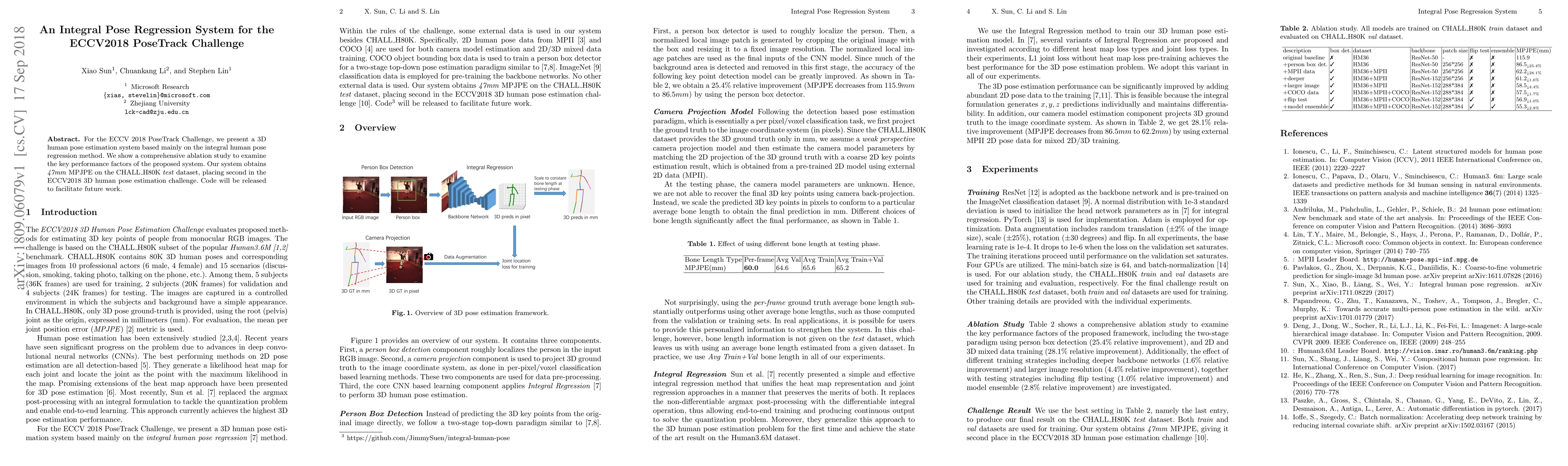 This paper introduces a 3D human pose estimation system for the ECCV 2018 PoseTrack Challenge, utilizing an integral human pose regression method, and achieves a 47mm MPJPE on the CHALL_H80K test dataset, securing second place in the competition. An ablation study is conducted to analyze the system's performance factors.