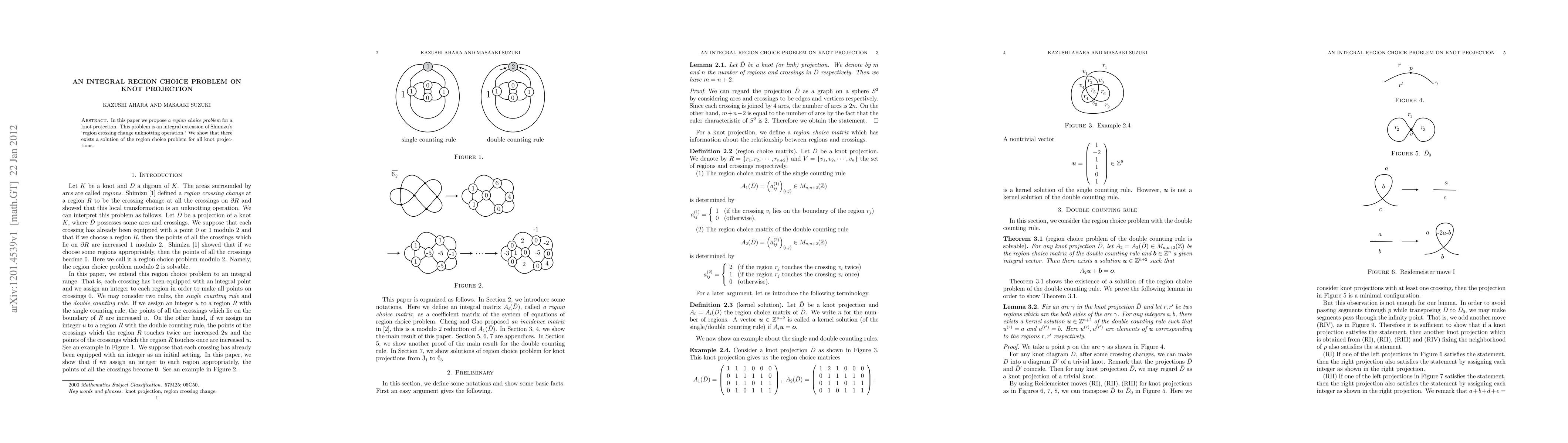 In this paper we propose {\it a region choice problem} for a knot projection. This problem is an integral extension of Shimizu's 'region crossing change unknotting operation.' We show that there exists a solution of the region choice problem for all knot projections.