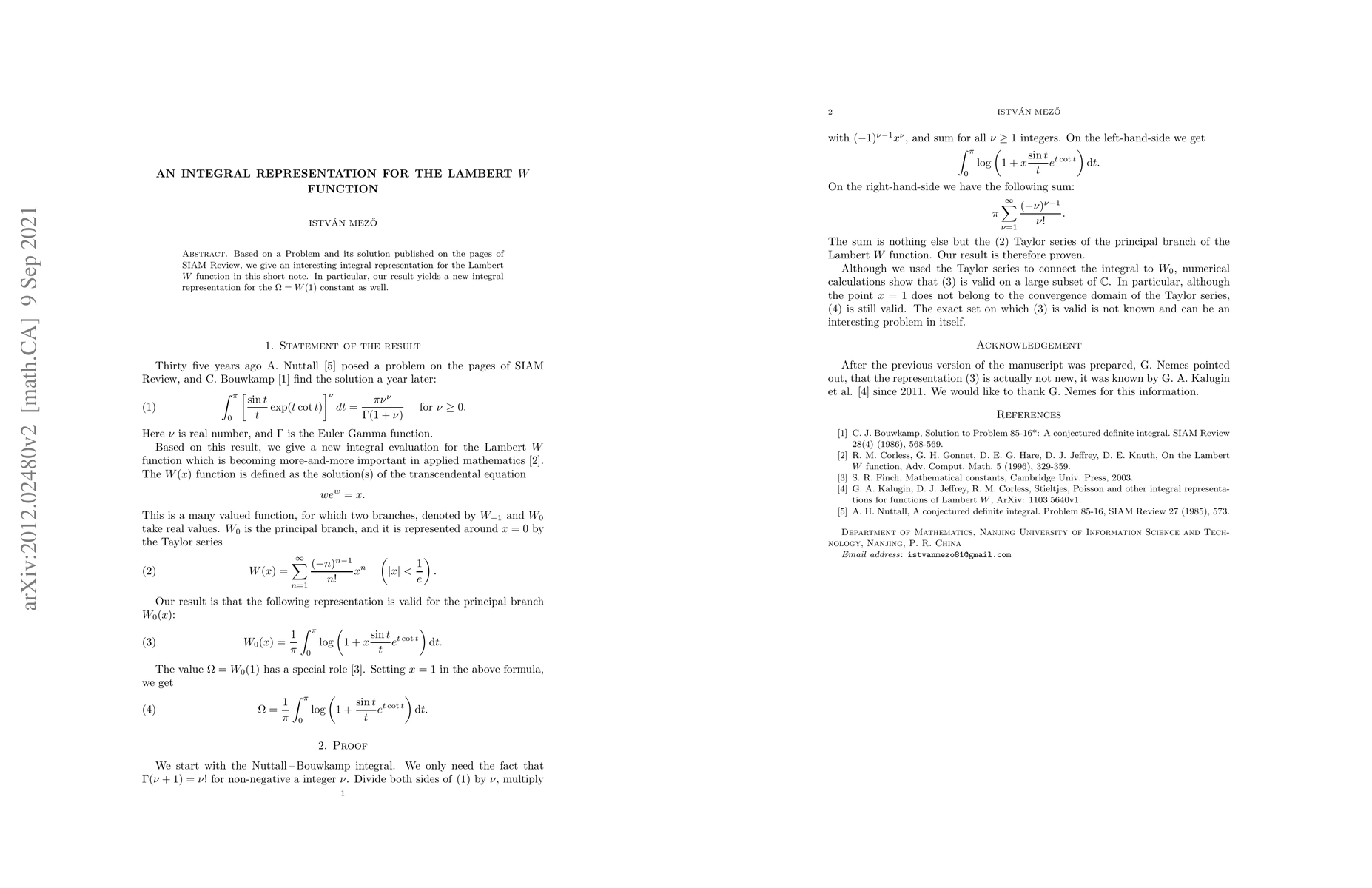 A new integral representation for the Lambert W function is introduced, providing a unique approach to solving the function, with implications for understanding constant $oxed{ ext{Omega}}$ values.