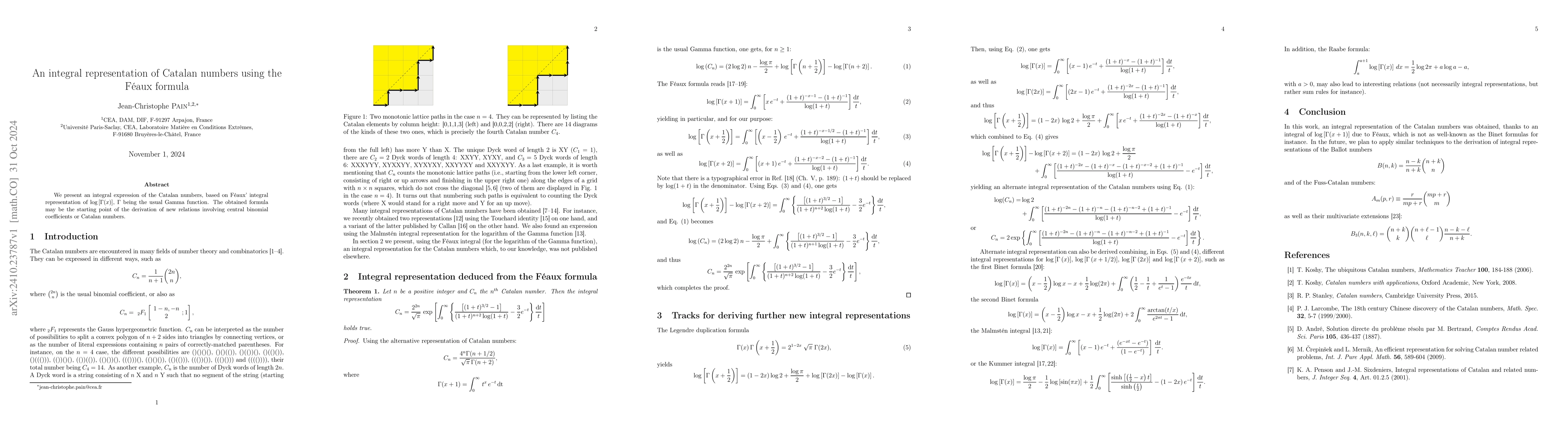 Summary: This paper derives an integral representation for Catalan numbers using F\'eaux's formula for $\log[\Gamma(x)]$, potentially leading to new relations involving central binomial coefficients or Catalan numbers.