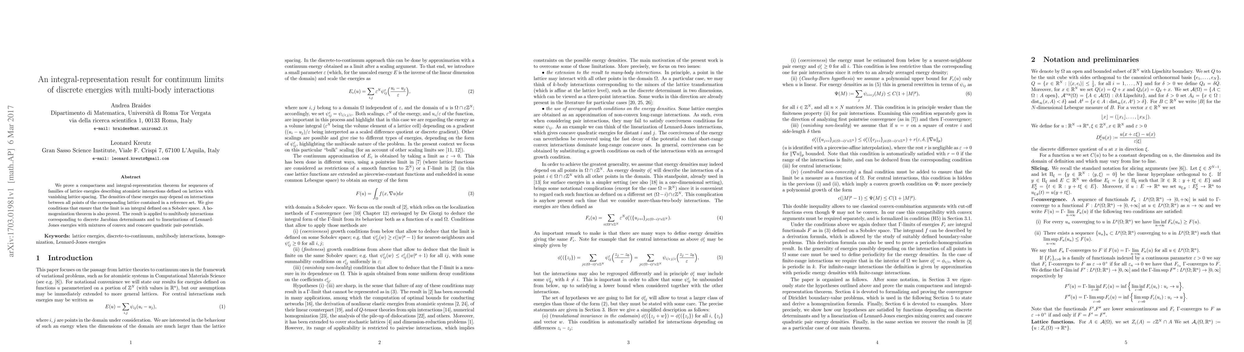 This paper proves a compactness and integral-representation theorem for sequences of lattice energies with multi-body interactions, showing that the continuum limit is an integral on a Sobolev space. The result is applied to multibody interactions involving discrete Jacobian determinants and linearizations of Lennard-Jones energies.