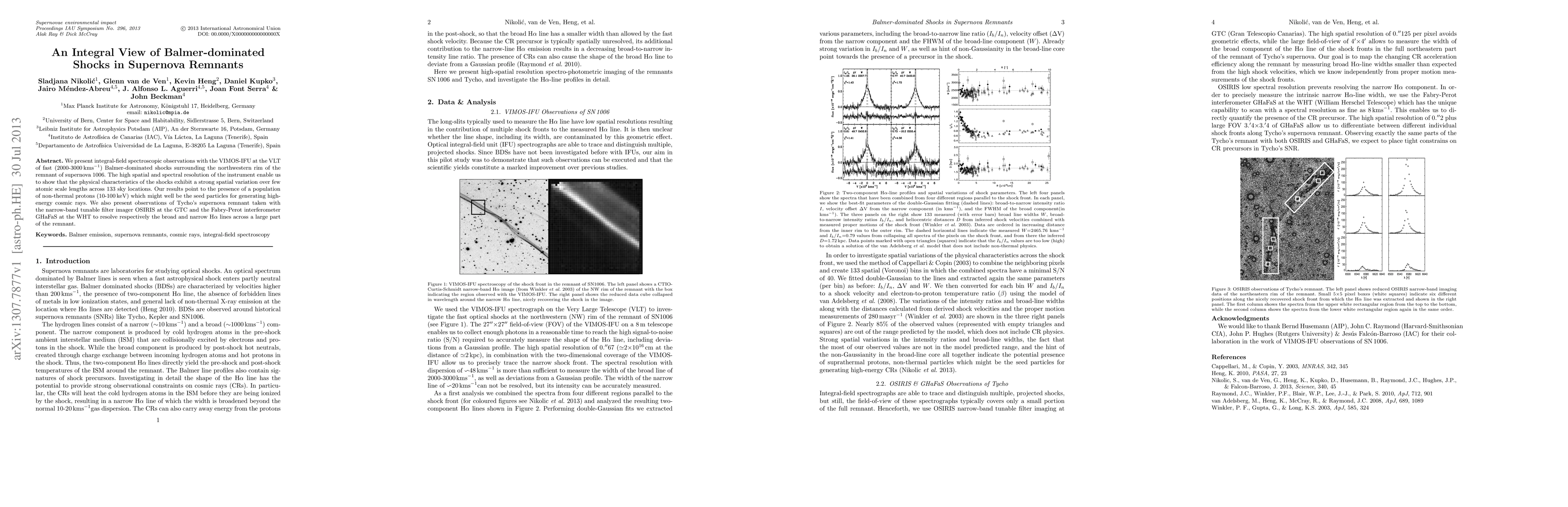 Researchers observed Balmer-dominated shocks in a supernova remnant using high-resolution instruments, finding non-thermal protons that may generate cosmic rays and resolving H-alpha lines across the remnant.