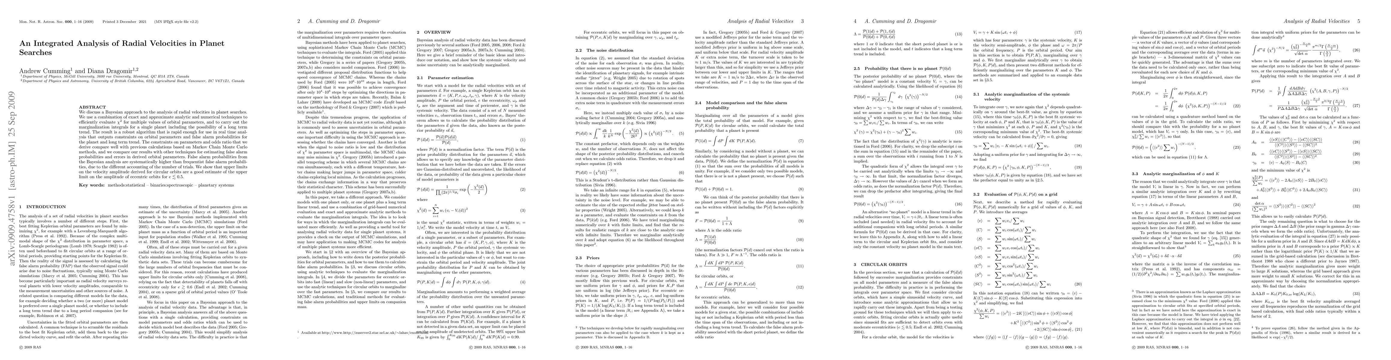 We discuss a Bayesian approach to the analysis of radial velocities in planet searches. We use a combination of exact and approximate analytic and numerical techniques to efficiently evaluate chi-squared for multiple values of orbital parameters, and to carry out the marginalization integrals for a single planet including the possibility of a long term trend. The result is a robust algorithm that is rapid enough for use in real time analysis that outputs constraints on orbital parameters and false alarm probabilities for the planet and long term trend. The constraints on parameters and odds ratio that we derive compare well with previous calculations based on Markov Chain Monte Carlo methods, and we compare our results with other techniques for estimating false alarm probabilities and errors in derived orbital parameters. False alarm probabilities from the Bayesian analysis are systematically higher than frequentist false alarm probabilities, due to the different accounting of the number of trials. We show that upper limits on the velocity amplitude derived for circular orbits are a good estimate of the upper limit on the amplitude of eccentric orbits for eccentricities less than about 0.5.