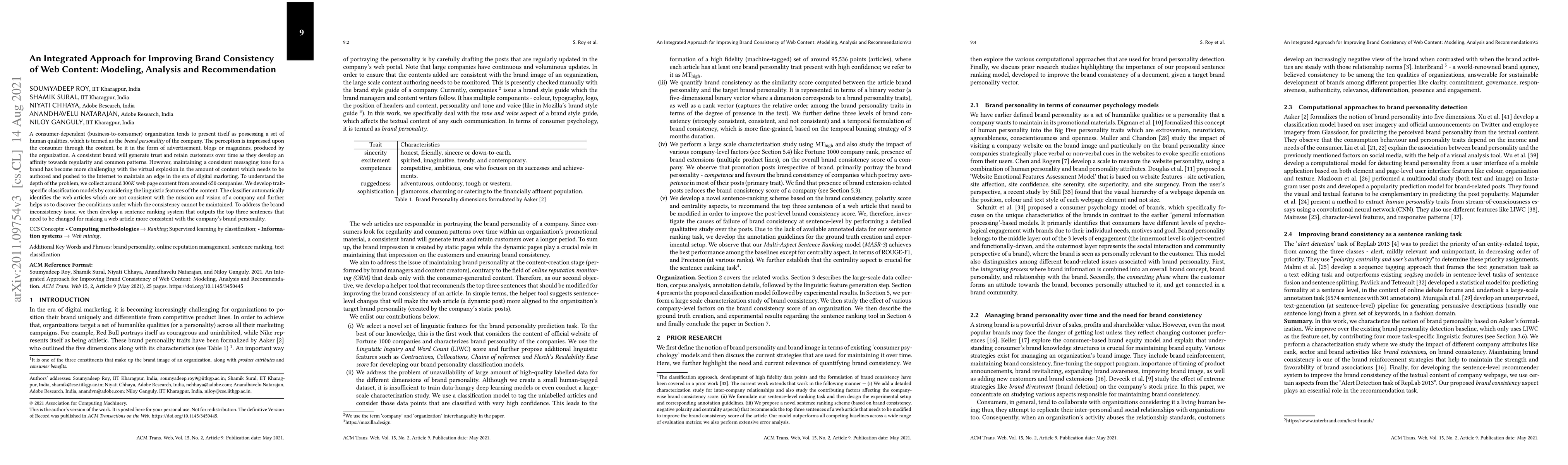 A study analyzed 300K web page content from 650 companies to identify inconsistent brand messaging, developing a system to rank sentences for improvement and promoting trust with consistent branding. The research aims to address the challenge of maintaining brand consistency in digital marketing.
