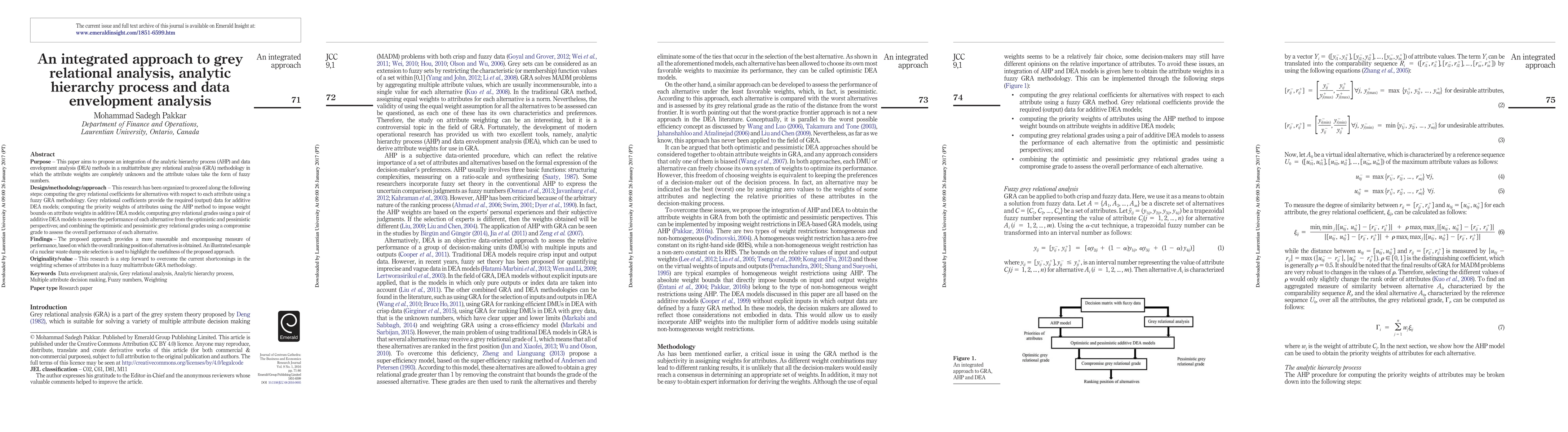 Purpose: This paper aims to propose an integration of the analytic hierarchy process (AHP) and data envelopment analysis (DEA) methods in a multiattribute grey relational analysis (GRA) methodology in which the attribute weights are completely unknown and the attribute values take the form of fuzzy numbers. Design/methodology/approach: This research has been organized to proceed along the following steps: computing the grey relational coefficients for alternatives with respect to each attribute using a fuzzy GRA methodology. Grey relational coefficients provide the required (output) data for additive DEA models; computing the priority weights of attributes using the AHP method to impose weight bounds on attribute weights in additive DEA models; computing grey relational grades using a pair of additive DEA models to assess the performance of each alternative from the optimistic and pessimistic perspectives; and combining the optimistic and pessimistic grey relational grades using a compromise grade to assess the overall performance of each alternative. Findings: The proposed approach provides a more reasonable and encompassing measure of performance, based on which the overall ranking position of alternatives is obtained. An illustrated example of a nuclear waste dump site selection is used to highlight the usefulness of the proposed approach. Originality/value: This research is a step forward to overcome the current shortcomings in the weighting schemes of attributes in a fuzzy multiattribute GRA methodology. Keywords: Data envelopment analysis, Grey relational analysis, Analytic hierarchy process, Multiple attribute decision making, Fuzzy numbers, Weighting.