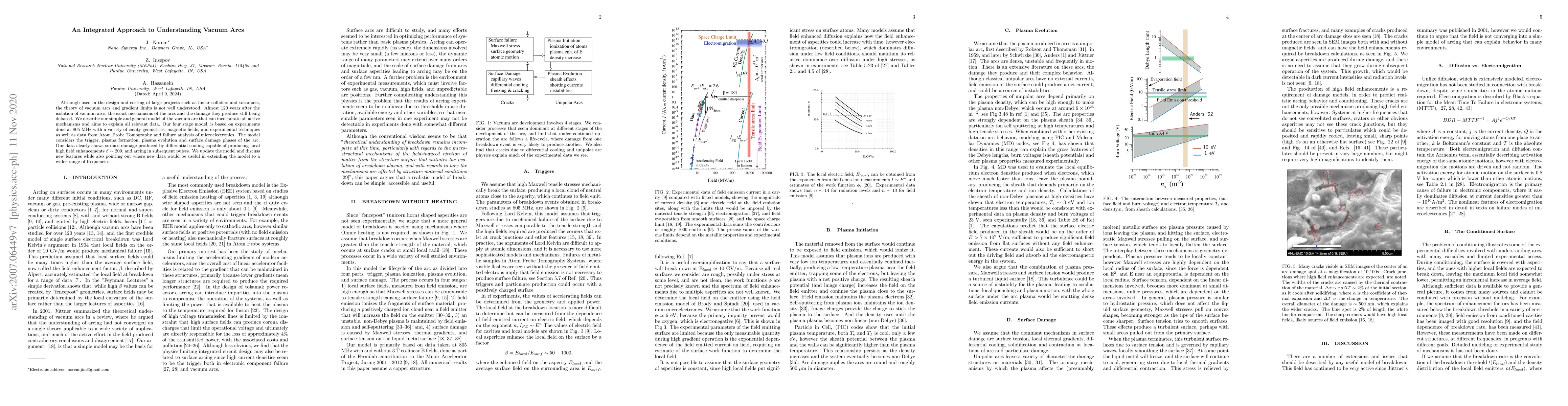 This paper presents a comprehensive four-stage model to explain vacuum arcs, incorporating trigger, plasma formation, evolution, and surface damage phases. The model is validated through experiments and data analysis, highlighting differential cooling as a key factor in surface damage and high field enhancements.