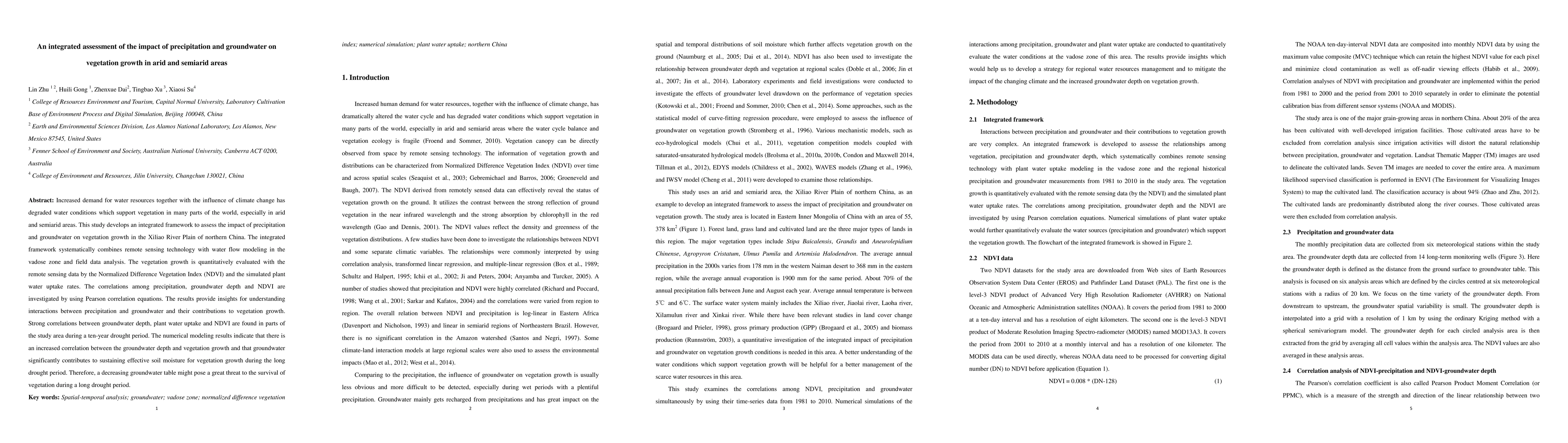 This study develops an integrated framework combining remote sensing and water flow modeling to assess the impact of precipitation and groundwater on vegetation growth in the Xiliao River Plain. Results show strong correlations between groundwater depth, plant water uptake, and vegetation growth, highlighting the critical role of groundwater in sustaining vegetation during prolonged droughts.