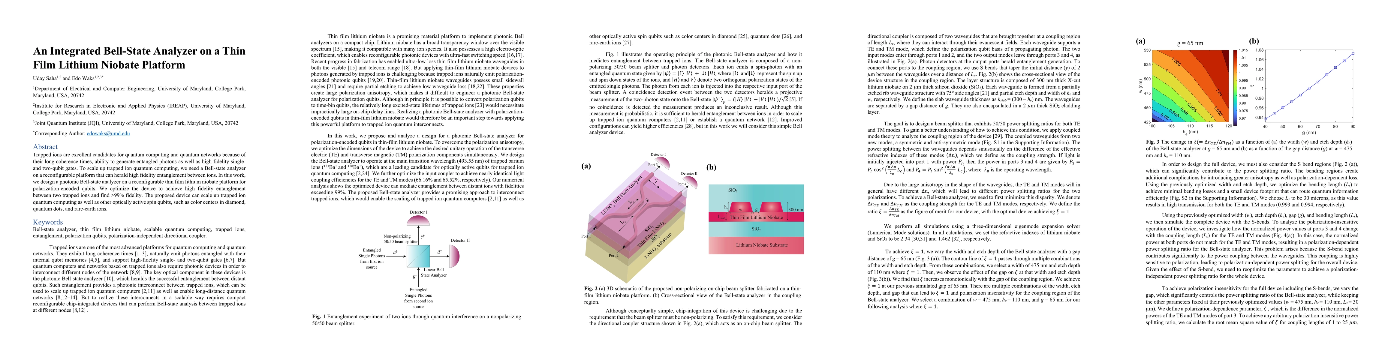 This paper designs a photonic Bell-state analyzer on a thin film lithium niobate platform to herald high fidelity entanglement between trapped ions for quantum computing. The device achieves >99% fidelity and can scale up to various optically active spin qubits.