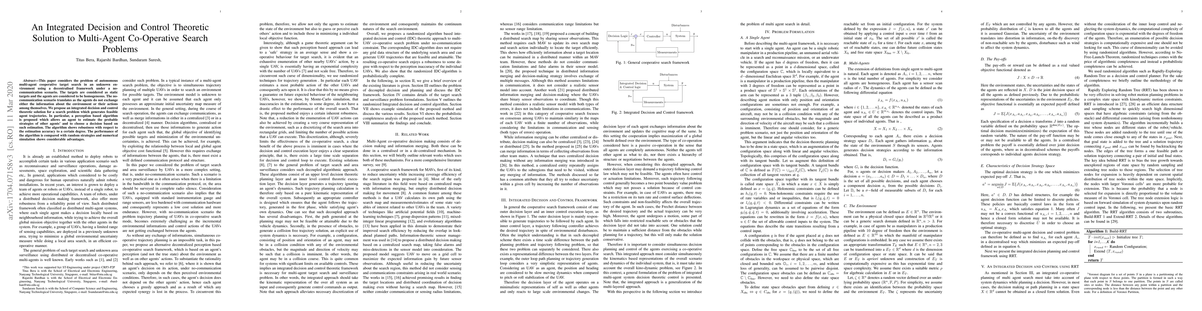This paper considers the problem of autonomous multi-agent cooperative target search in an unknown environment using a decentralized framework under a no-communication scenario. The targets are considered as static targets and the agents are considered to be homogeneous. The no-communication scenario translates as the agents do not exchange either the information about the environment or their actions among themselves. We propose an integrated decision and control theoretic solution for a search problem which generates feasible agent trajectories. In particular, a perception based algorithm is proposed which allows an agent to estimate the probable strategies of other agents' and to choose a decision based on such estimation. The algorithm shows robustness with respect to the estimation accuracy to a certain degree. The performance of the algorithm is compared with random strategies and numerical simulation shows considerable advantages.
