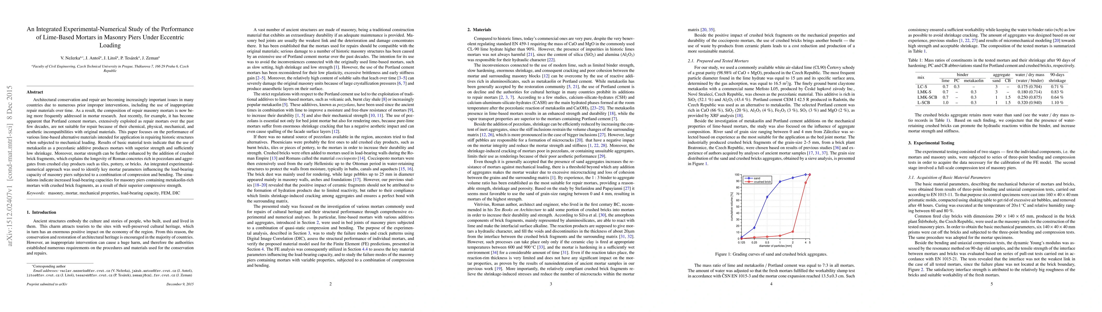 This study investigates the performance of lime-based mortars in repairing historic structures under eccentric loading, finding that metakaolin-rich mortars with crushed brick fragments improve load-bearing capacity.