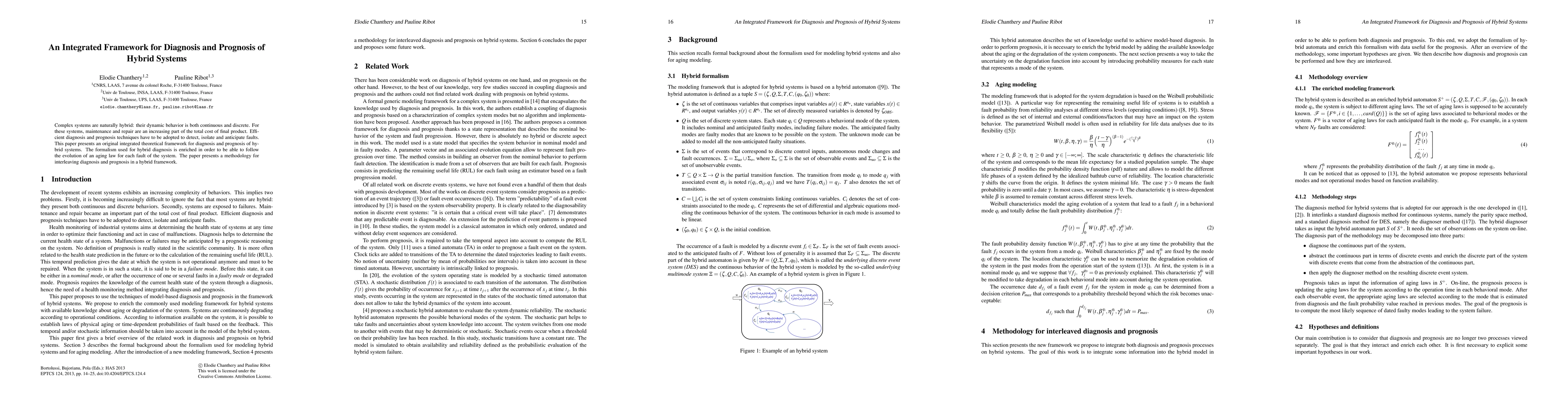 Complex systems are naturally hybrid: their dynamic behavior is both continuous and discrete. For these systems, maintenance and repair are an increasing part of the total cost of final product. Efficient diagnosis and prognosis techniques have to be adopted to detect, isolate and anticipate faults. This paper presents an original integrated theoretical framework for diagnosis and prognosis of hybrid systems. The formalism used for hybrid diagnosis is enriched in order to be able to follow the evolution of an aging law for each fault of the system. The paper presents a methodology for interleaving diagnosis and prognosis in a hybrid framework.