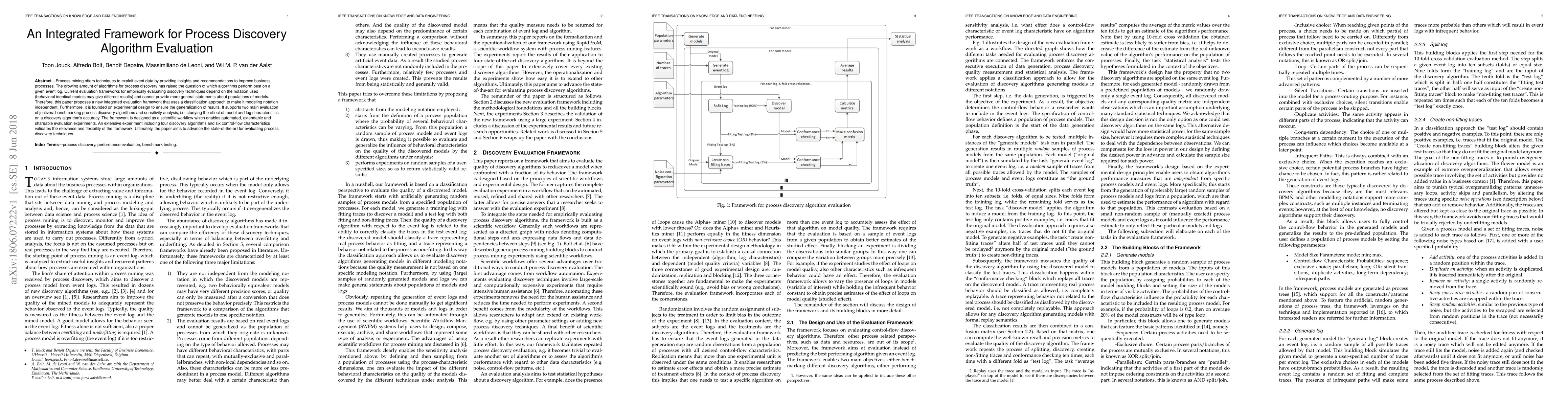 This paper proposes an integrated evaluation framework for assessing process discovery algorithms, aiming to overcome notation-dependent limitations of existing frameworks. It uses a classification approach and experimental design for generalization, supporting benchmarking and sensitivity analysis, and is validated through experiments with four algorithms and six characteristics.