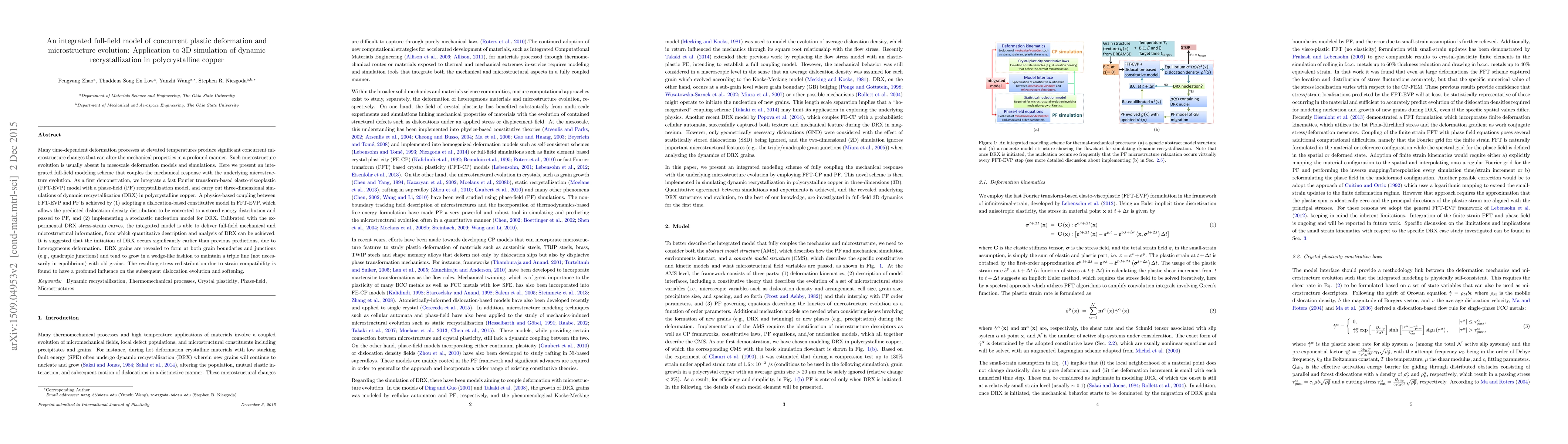 Many time-dependent deformation processes at elevated temperatures produce significant concurrent microstructure changes that can alter the mechanical properties in a profound manner. Such microstructure evolution is usually absent in mesoscale deformation models and simulations. Here we present an integrated full-field modeling scheme that couples the mechanical response with the underlying microstructure evolution. As a first demonstration, we integrate a fast Fourier transform-based elasto-viscoplastic (FFT-EVP) model with a phase-field (PF) recrystallization model, and carry out three-dimensional (3D) simulations of dynamic recrystallization (DRX) in polycrystalline copper. A physics-based coupling between FFT-EVP and PF is achieved by (1) adopting a dislocation-based constitutive model in FFT-EVP, which allows the predicted dislocation density distribution to be converted to a stored energy distribution and passed to PF, and (2) implementing a stochastic nucleation model for DRX. Calibrated with the experimental DRX stress-strain curves, the integrated model is able to deliver full-field mechanical and microstructural information, from which quantitative description and analysis of DRX can be achieved. It is suggested that the initiation of DRX occurs significantly earlier than previous predictions, due to heterogeneous deformation. DRX grains are revealed to form at both grain boundaries and junctions (e.g., quadruple junctions) and tend to maintain a triple line with old grains during the growth. The resulted stress redistribution is found to have a profound influence on the subsequent dislocation evolution and the softening.