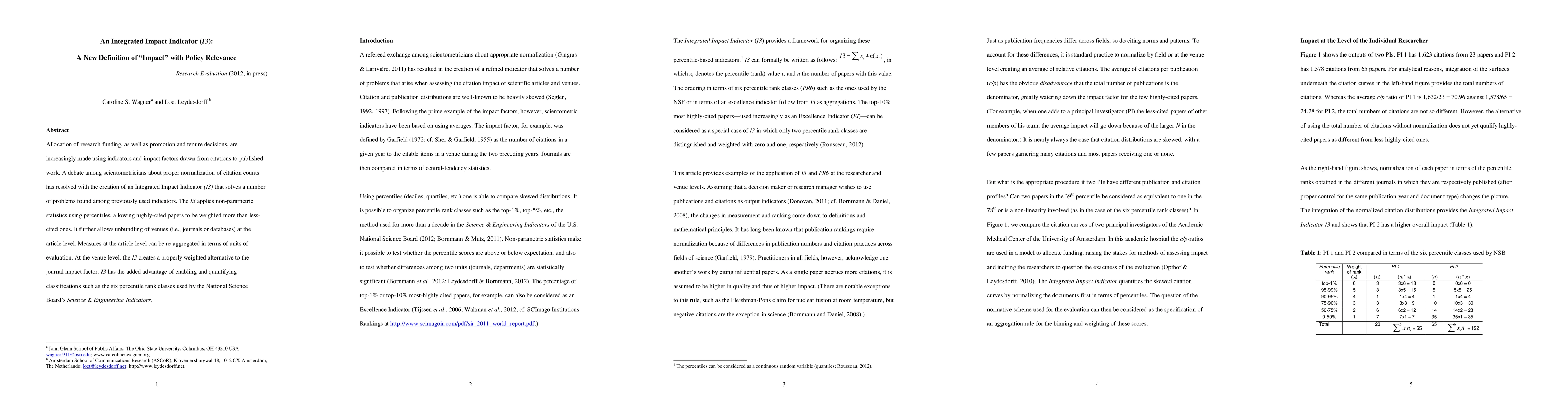 The Integrated Impact Indicator (I3) redefines "impact" in research evaluation, addressing normalization issues in citation counts with non-parametric statistics. It allows for the weighting of highly-cited papers and unbundling of venues, providing a venue-level alternative to the journal impact factor.