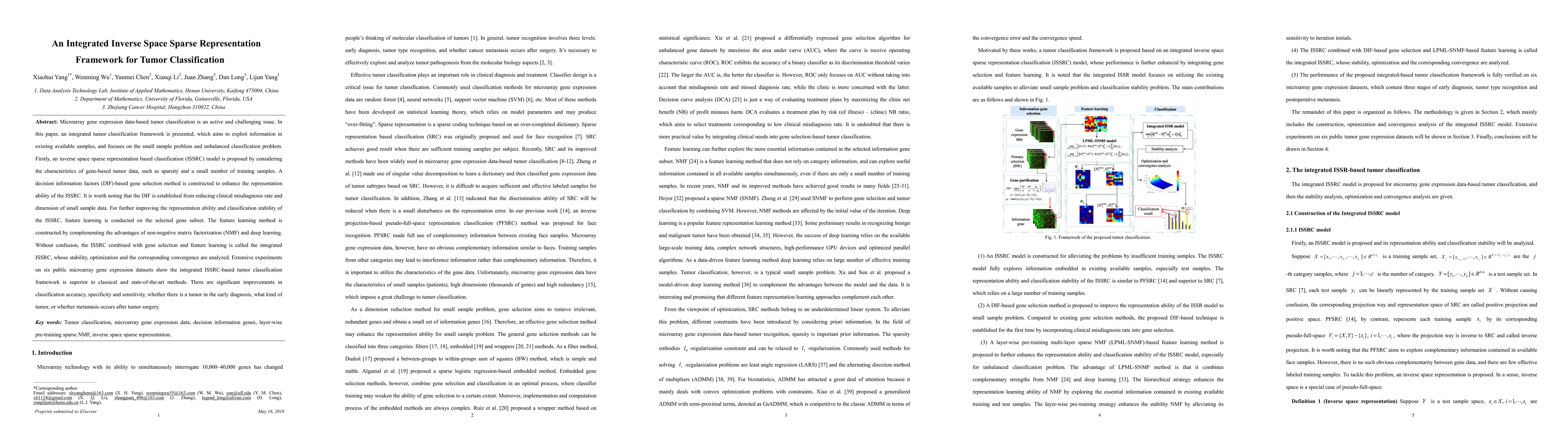 This paper proposes an integrated inverse space sparse representation framework for tumor classification, addressing small sample and unbalanced classification issues. It combines inverse space sparse representation, gene selection based on decision information factors, and feature learning via non-negative matrix factorization and deep learning to enhance classification accuracy, specificity, and sensitivity.