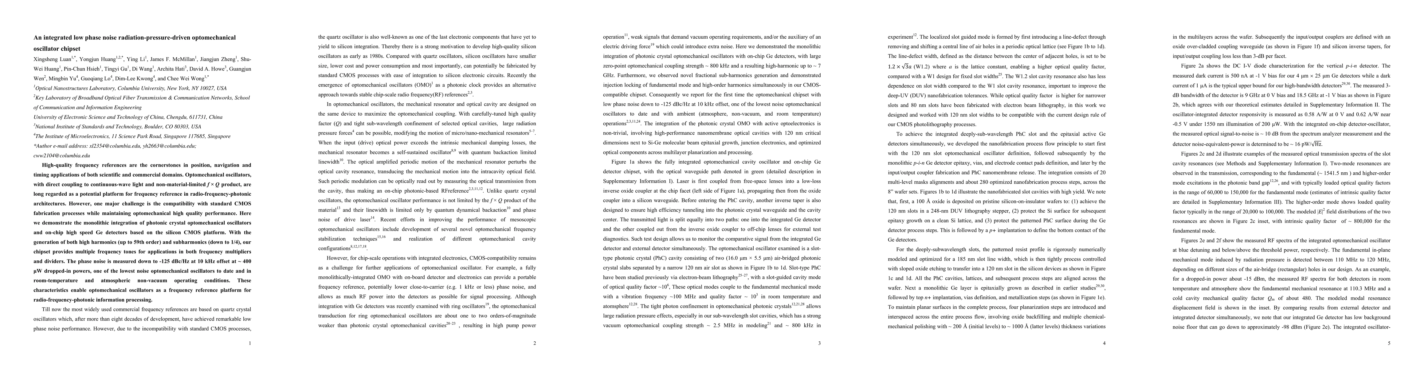 High-quality frequency references are the cornerstones in position, navigation and timing applications of both scientific and commercial domains. Optomechanical oscillators, with direct coupling to continuous-wave light and non-material-limited f Q product, are long regarded as a potential platform for frequency reference in radio-frequency-photonic architectures. However, one major challenge is the compatibility with standard CMOS fabrication processes while maintaining optomechanical high quality performance. Here we demonstrate the monolithic integration of photonic crystal optomechanical oscillators and on-chip high speed Ge detectors based on the silicon CMOS platform. With the generation of both high harmonics (up to 59th order) and subharmonics (down to 1/4), our chipset provides multiple frequency tones for applications in both frequency multipliers and dividers. The phase noise is measured down to -125 dBc/Hz at 10 kHz offset at ~ 400 {\mu}W dropped-in powers, one of the lowest noise optomechanical oscillators to date and in room-temperature and atmospheric non-vacuum operating conditions. These characteristics enable optomechanical oscillators as a frequency reference platform for radio-frequency-photonic information processing.