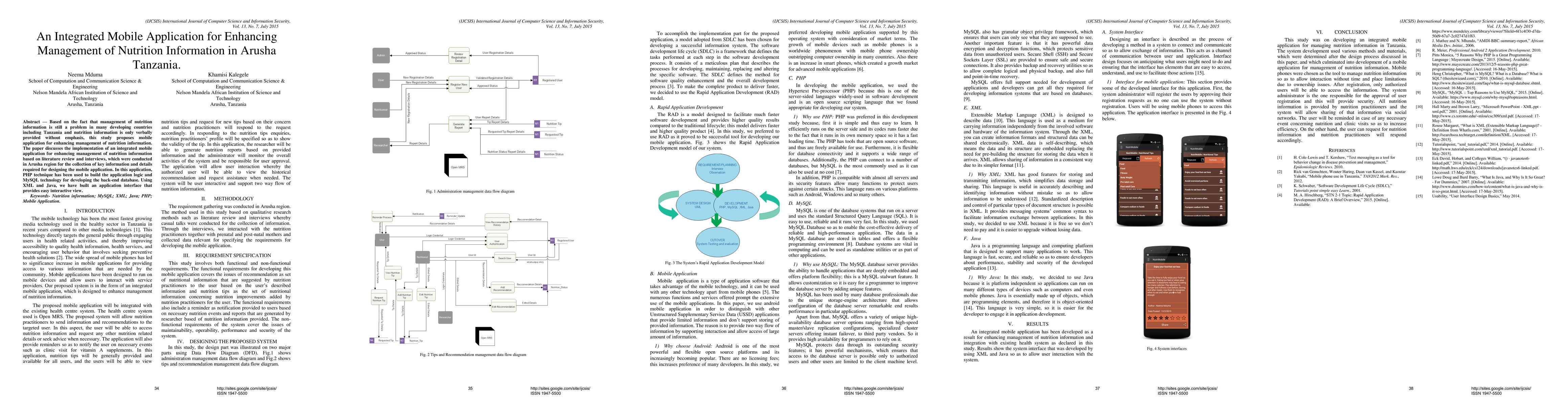 This study proposes a mobile application for better management of nutrition information in Arusha, Tanzania, addressing the lack of structured nutrition data. The application, developed using PHP, MySQL, XML, and Java, aims to improve data collection and accessibility through an interactive interface.