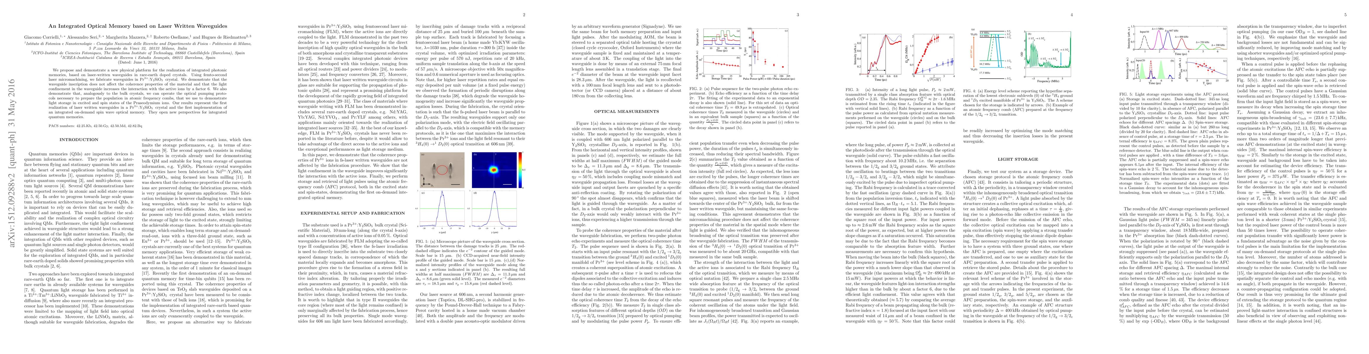 This paper presents the first integrated optical memory based on laser-written waveguides in a Pr$^{3+}$:Y$_2$SiO$_5$ crystal, demonstrating enhanced interaction with active ions and successful light storage in excited and spin states of Praseodymium ions, paving the way for integrated quantum memories.