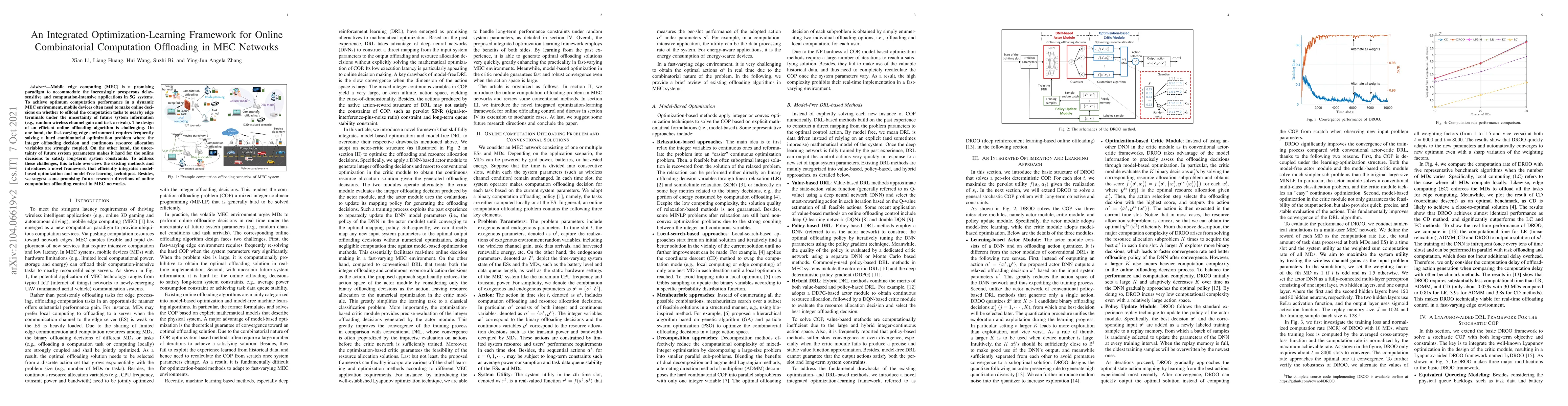 This paper proposes an integrated optimization-learning framework for online combinatorial computation offloading in mobile edge computing (MEC) networks. It combines model-based optimization and model-free learning to tackle the dynamic and uncertain nature of MEC environments, offering a novel approach to efficiently manage computation tasks.
