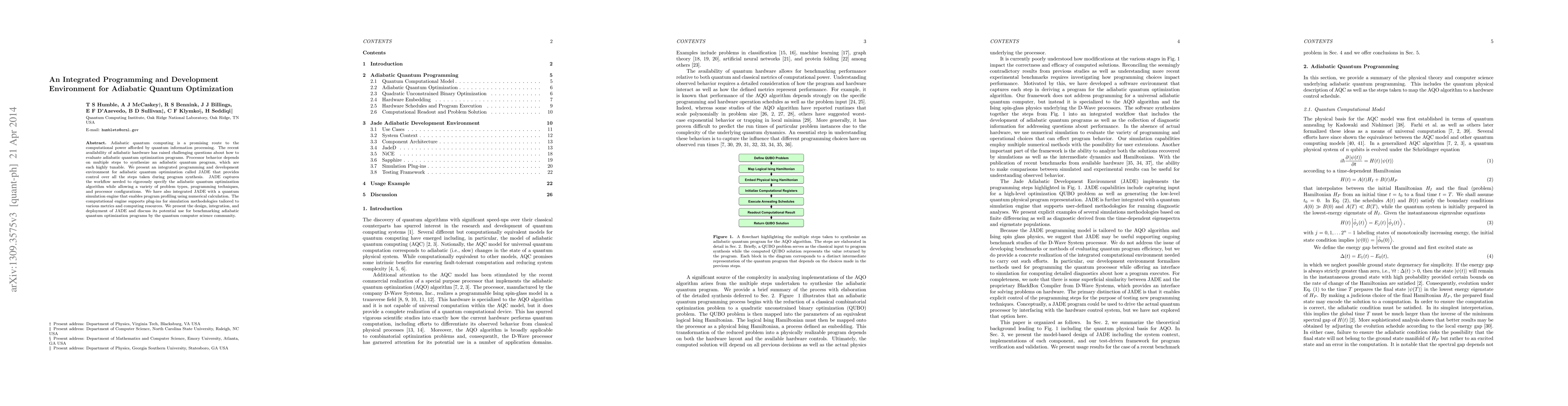 This paper presents JADE, an integrated programming and development environment for adiabatic quantum optimization, which allows control over program synthesis steps and supports various problem types and processor configurations. JADE is coupled with a quantum simulation engine for profiling and benchmarking, aiming to facilitate the evaluation of adiabatic quantum optimization programs.