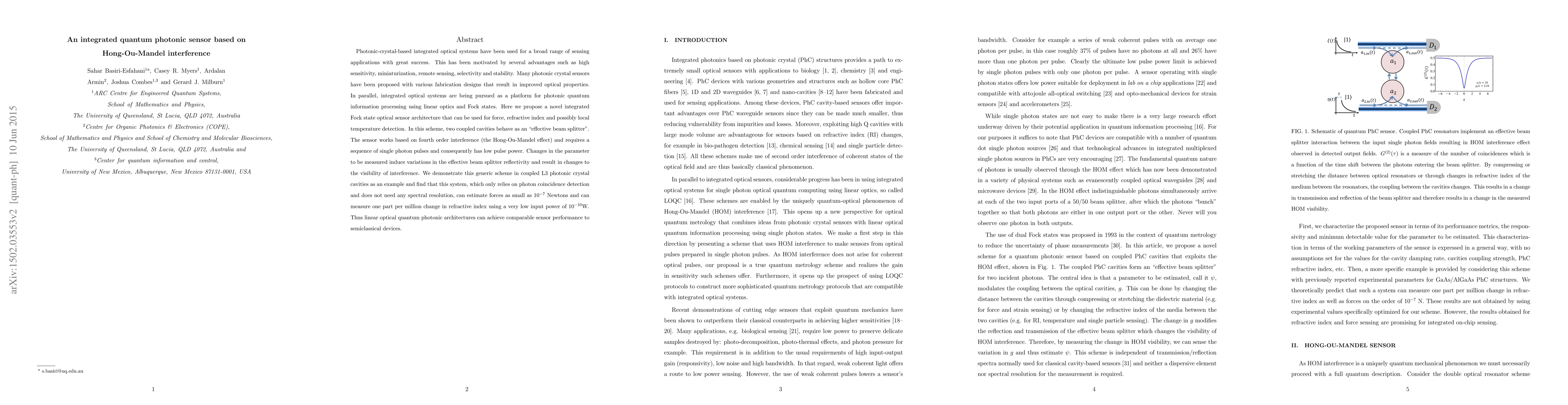 This paper proposes an integrated photonic sensor based on the Hong-Ou-Mandel effect for detecting forces, refractive indices, and local temperatures. The sensor utilizes coupled photonic crystal cavities as an effective beam splitter and achieves high sensitivity with minimal input power, demonstrating the potential of linear optical quantum photonic architectures for sensing applications.