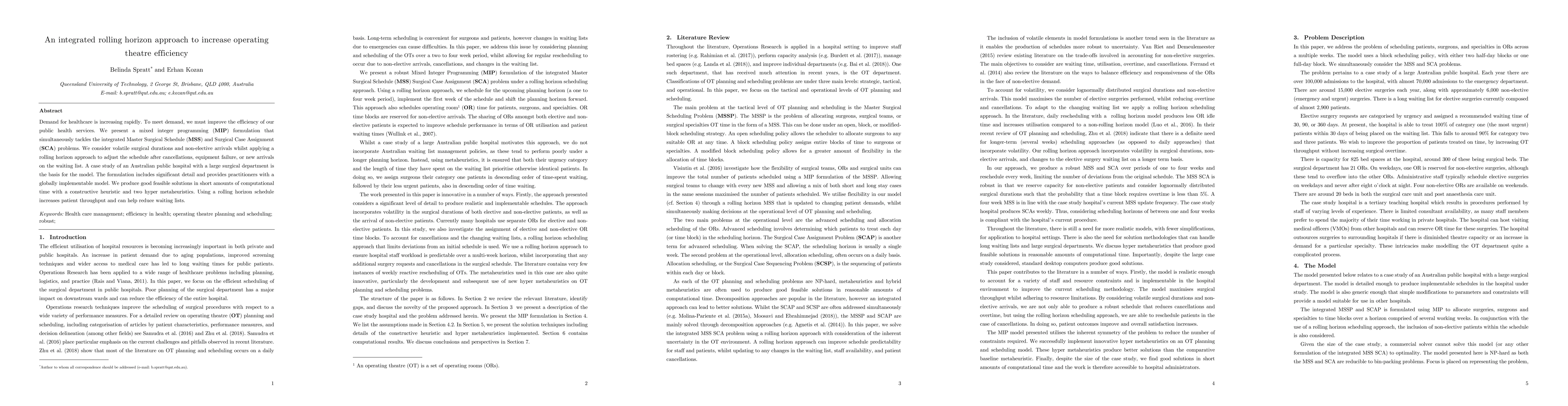 Demand for healthcare is increasing rapidly. To meet demand, we must improve the efficiency of our public health services. We present a mixed integer programming (MIP) formulation that simultaneously tackles the integrated Master Surgical Schedule (MSS) and Surgical Case Assignment (SCA) problems. We consider volatile surgical durations and non-elective arrivals whilst applying a rolling horizon approach to adjust the schedule after cancellations, equipment failure, or new arrivals on the waiting list. A case study of an Australian public hospital with a large surgical department is the basis for the model. The formulation includes significant detail and provides practitioners with a globally implementable model. We produce good feasible solutions in short amounts of computational time with a constructive heuristic and two hyper metaheuristics. Using a rolling horizon schedule increases patient throughput and can help reduce waiting lists.