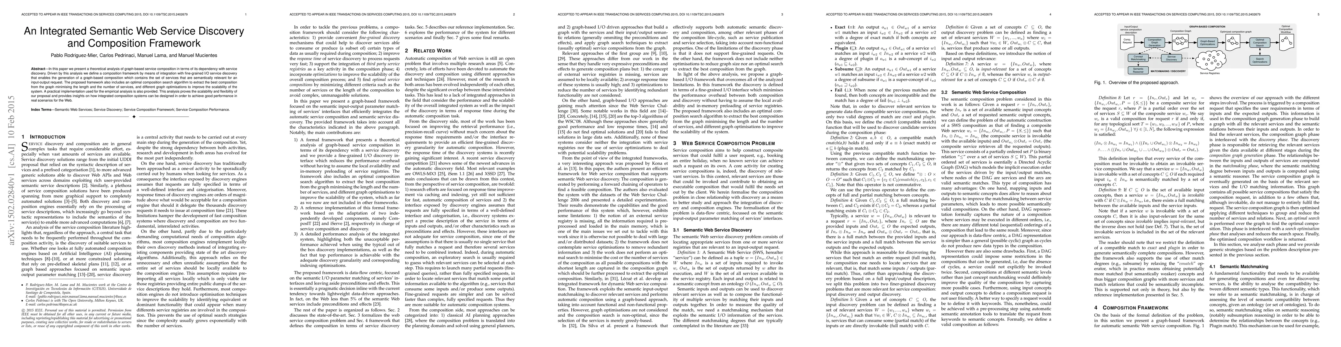 This paper introduces a framework for integrated semantic web service discovery and composition, utilizing graph-based methods to optimize service selection and composition based on input-output requests. The framework includes an optimal algorithm for finding the best service composition and various graph optimizations to enhance scalability.