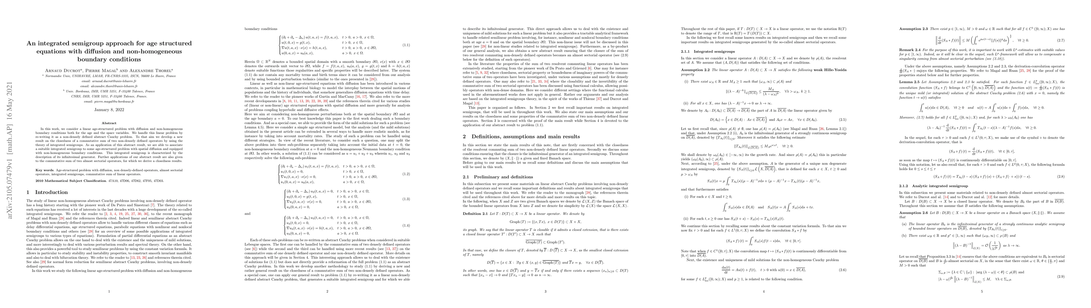 This paper develops an integrated semigroup approach to solve linear age-structured equations with diffusion and non-homogeneous boundary conditions. It introduces a new result on the closedness of a commutative sum of two non-densely defined operators, enabling the association of an integrated semigroup to such problems.